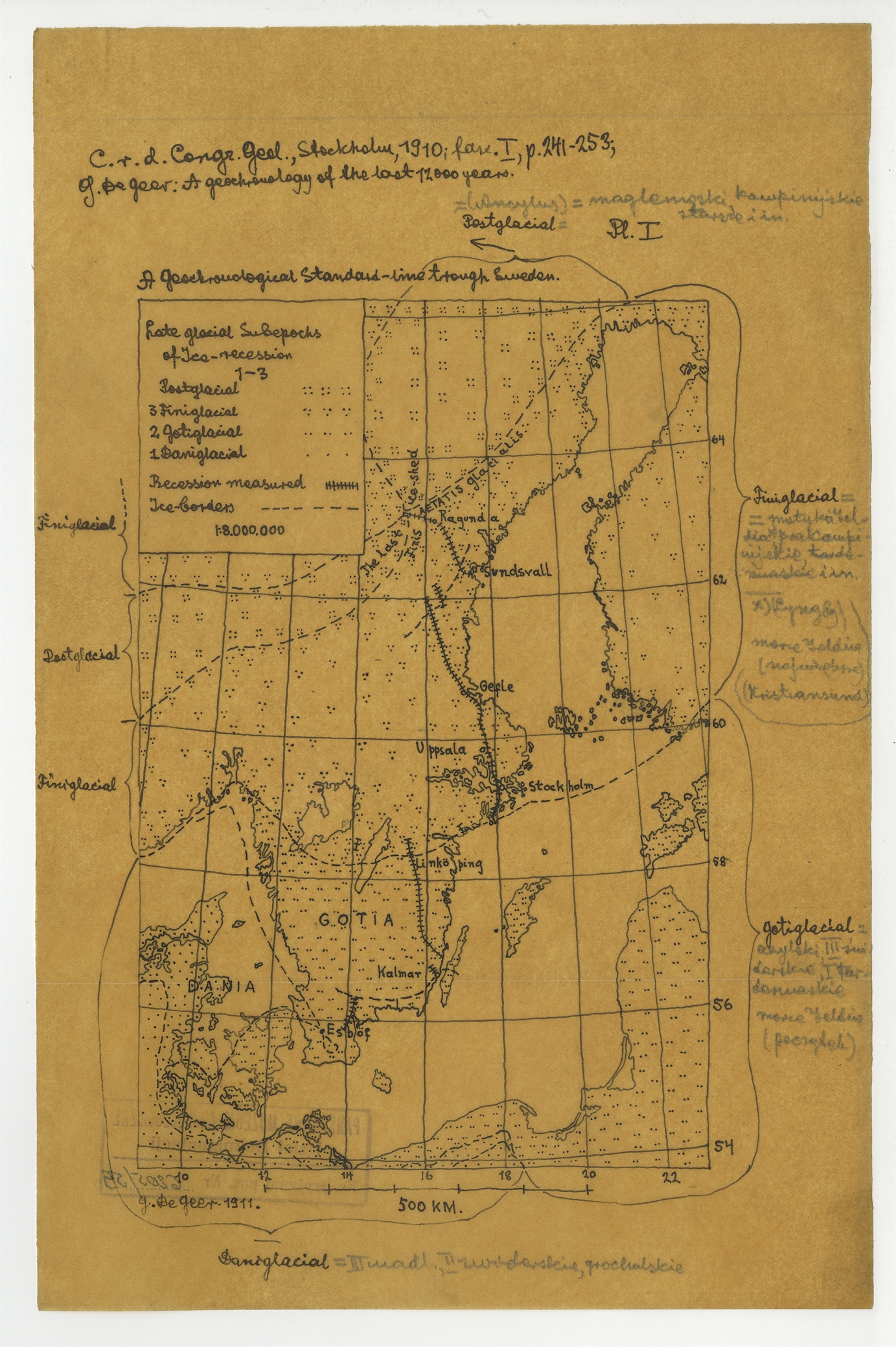 Element 1 - Przerys mapki (na kalce) pt. "Late glacial Subepocks of Ice-recession" z publikacji Gerarda De Geer'a A geochronology of the last 12 000 years Stockholm 1910 - strona 1