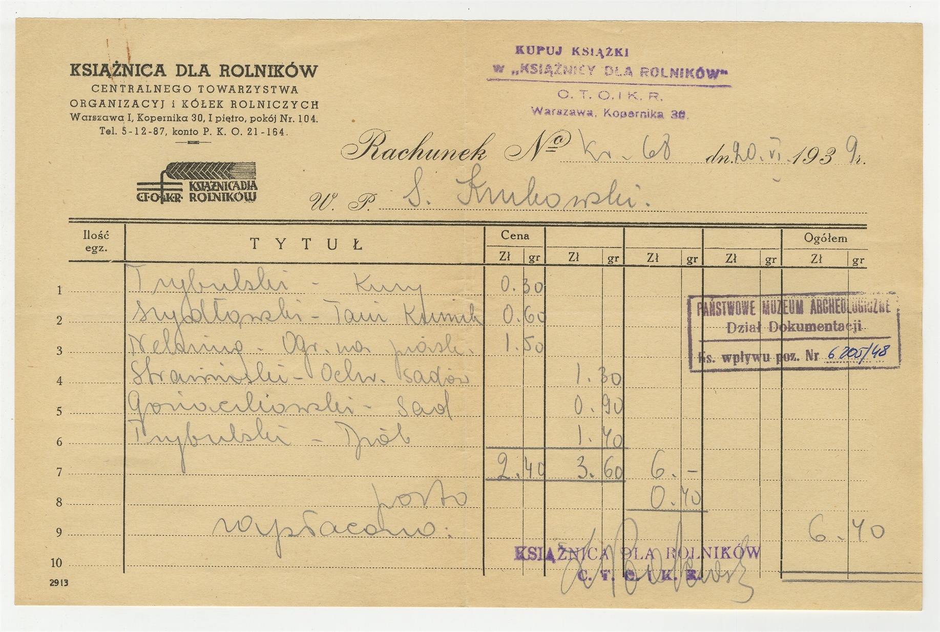 Rachunek na zakup sześciu publikacji wystawiony przez Książnicę Dla Rolników C. T. O. i K. R. na nazwisko S. Krukowskiego - strona 1: 20. VI. 1939