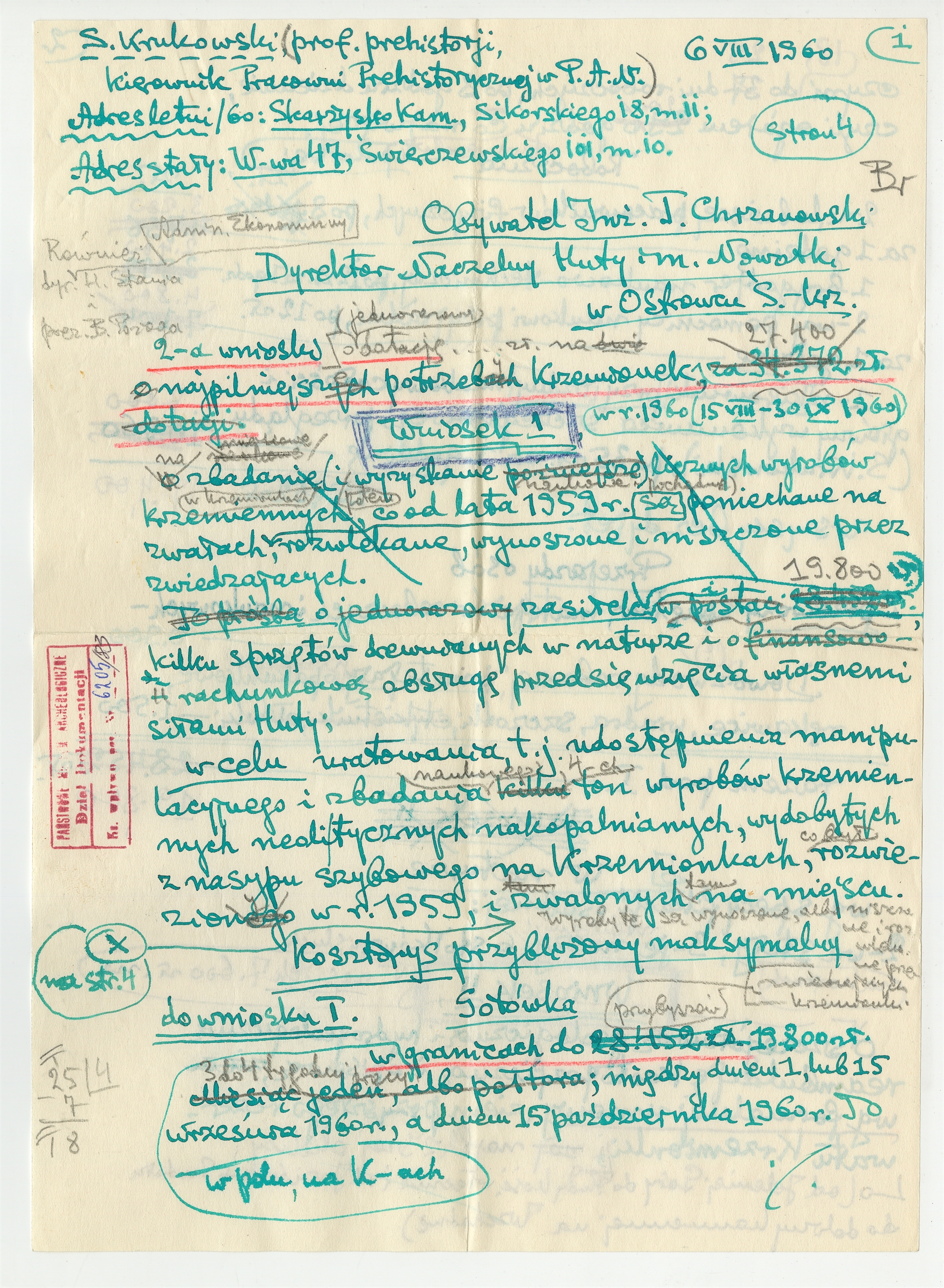 Rękopis - brudnopis dwóch wniosków Stefana Krukowskiego na badania i reambulację Krzemionek skierowane do Dyrektora Naczelnego Huty im Nowotki w Ostrowcu T. Chrzanowskiego - strona 1