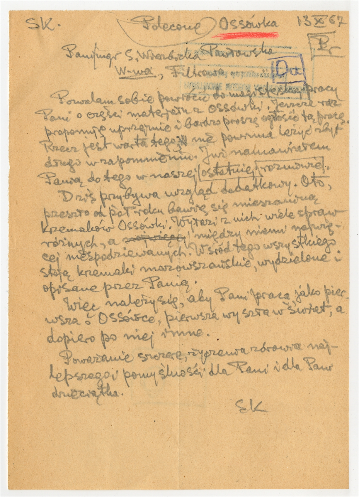 Rękopis-brudnopis listu prof. Stefana Krukowskiego z dnia 13 X [19]67 napisanego do pani S. Wierzbickiej-Pawłowskiej