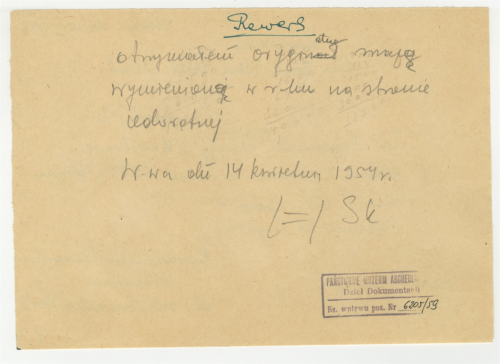 Rękopis - brudnopis rachunku Leonarda Baranowskiego dla Instytutu Historii Kultury Materialnej za opracowanie kartograficzne i wykonanie graficzne mapy pt. "Dniestrowe glenie i gleniaki w roku 1954" Warszawa 14 IV [19]54 r. - strona 2: rękopis poświadczenia Stefana Krukowskiego o otrzymaniu w/w mapy Warszawa 14 kwietnia 1954 r.
