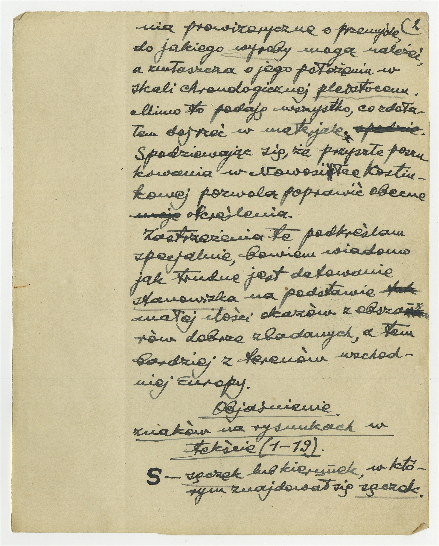 Rękopis części pracy zatytułowanej "II. Część prahistoryczna" wchodzącej w skład opracowania S. Krukowskiego oraz J. Polańkiego pt. "Pierwsze stanowisko paleolityczne w Nowosiółce Kostiukowej (Podole)" - strona 2: "Objaśnienie znaków na rysunkach w tekście (1-19)"