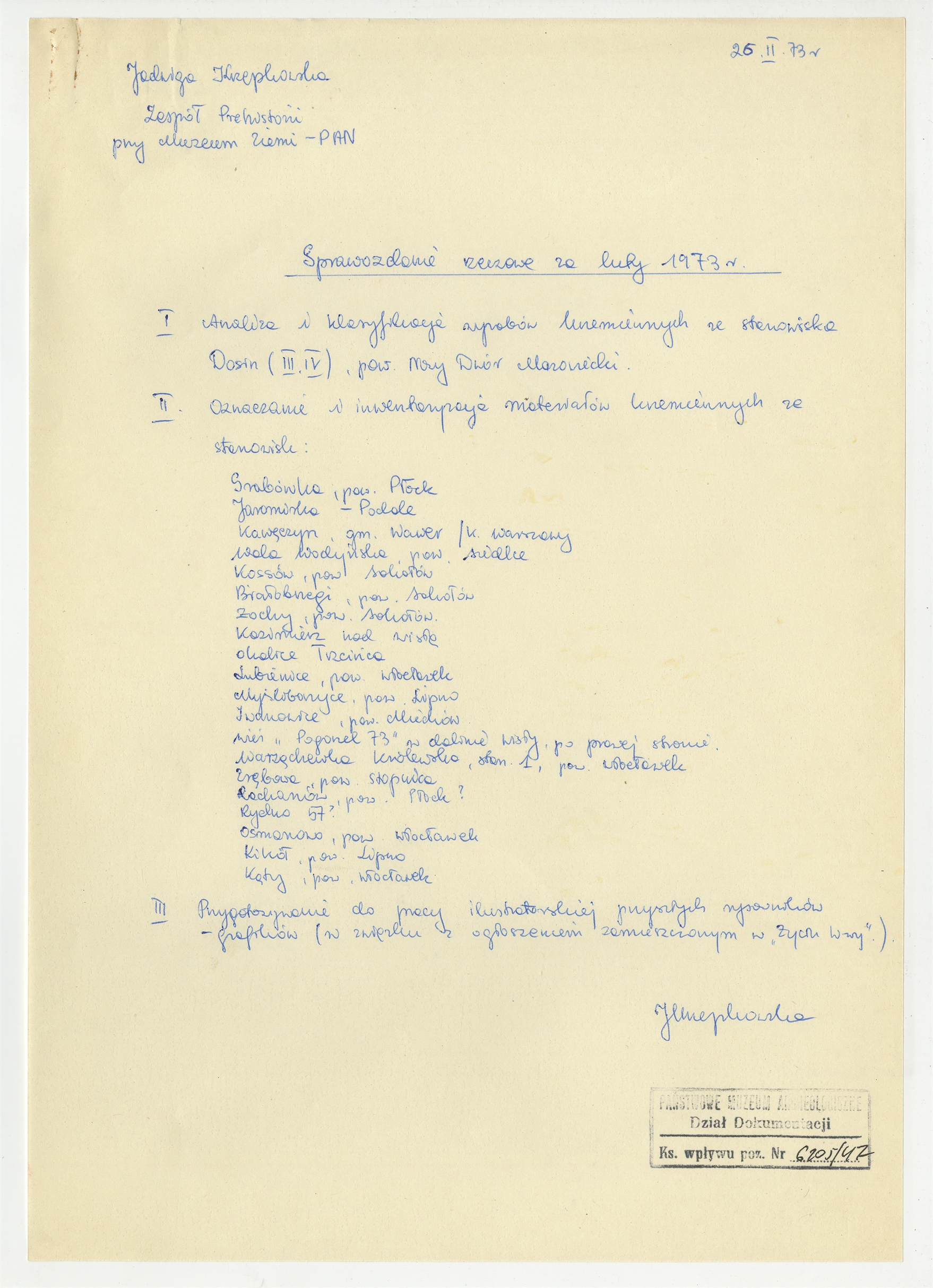 Rękopis dokumentu pt. "Sprawozdanie rzeczowe za luty 1973 r." sporządzony przez Jadwigę Krzepkowską członka Zespołu Prehistorii przy Muzeum Ziemi PAN 26 II [19]73 r. - strona 1