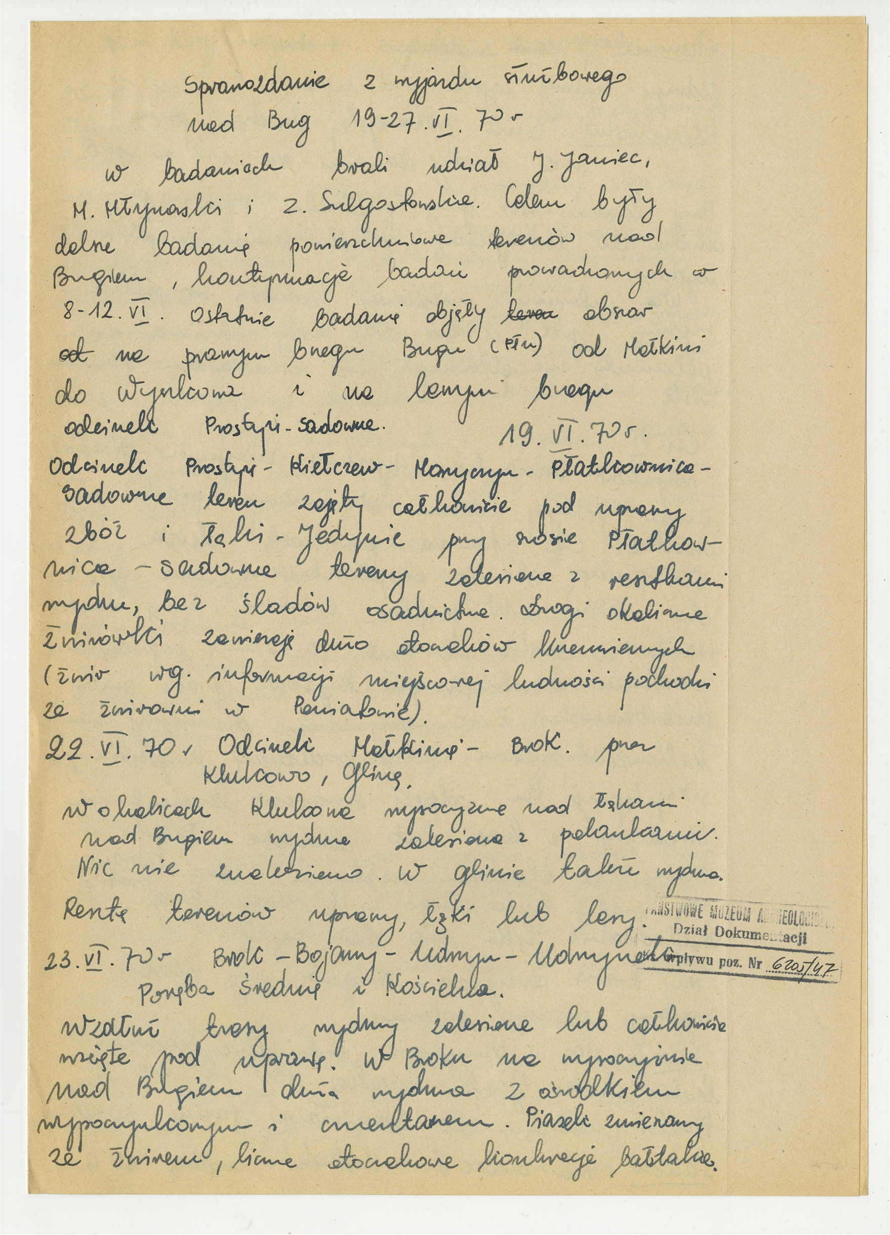 Rękopis dokumentu pt. "Sprawozdanie z wyjazdu służbowego nad Bug 19-27 VI 70 r." sporządzony ręką NN przez Zespół Prehistorii przy Muzeum Ziemi PAN - strona 1: "W badaniach brali udział (…)"