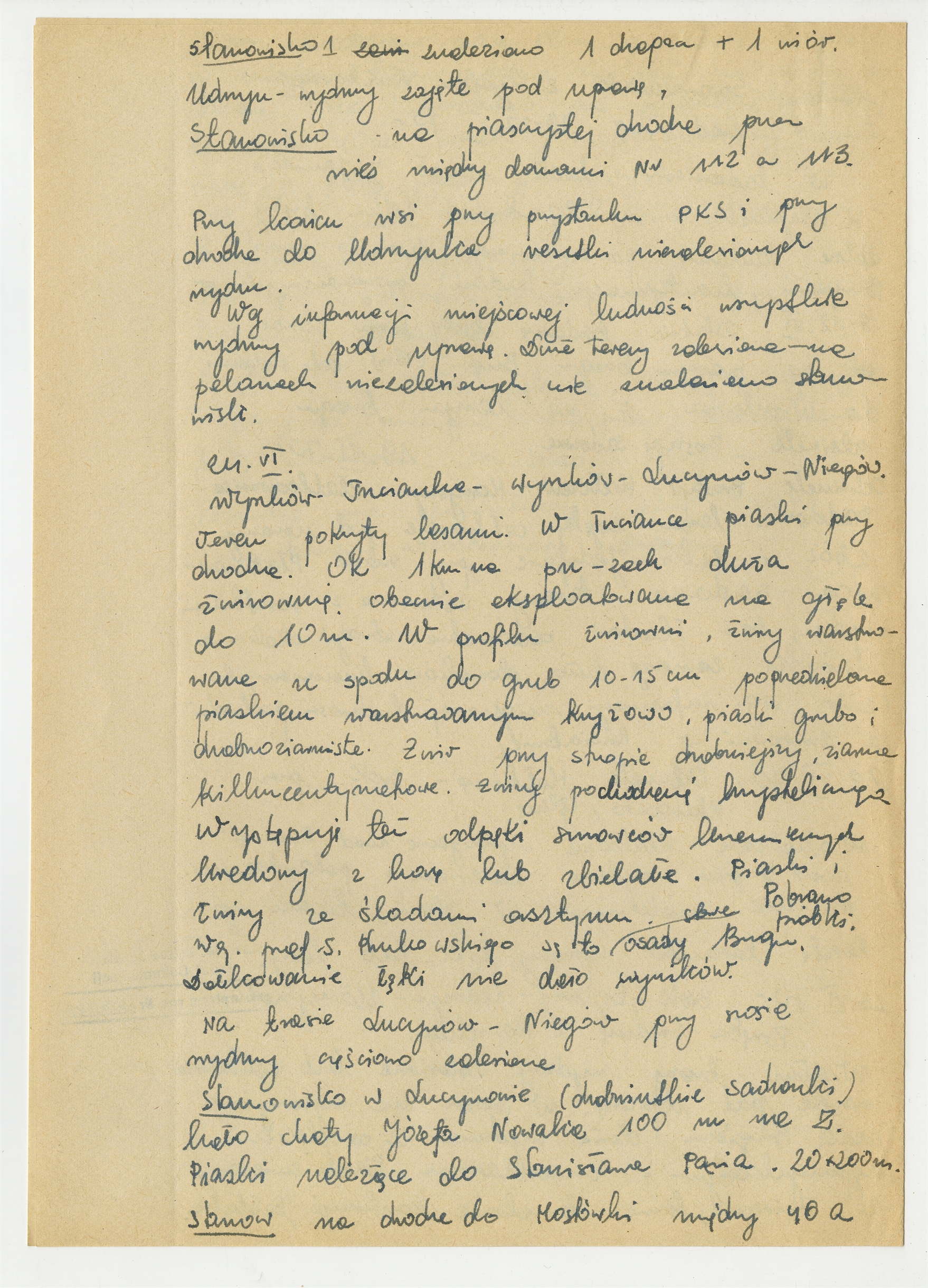 Rękopis dokumentu pt. "Sprawozdanie z wyjazdu służbowego nad Bug 19-27 VI 70 r." sporządzony ręką NN przez Zespół Prehistorii przy Muzeum Ziemi PAN - strona 2: "(…) Stanowisko 1 znaleziono 1 drapacz (…)"