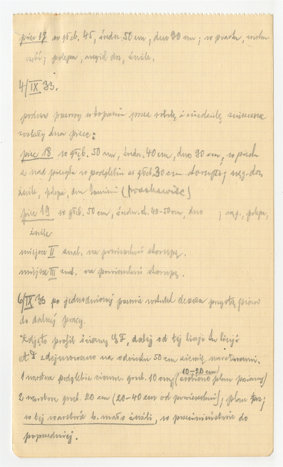 Rękopis - dziennik badań ze stanowiska Skowroniec (Małe Podgaje hucisko "Przemka") notatki z 1-6 IX [19]33 roku. Opisy warstw i obiektów.