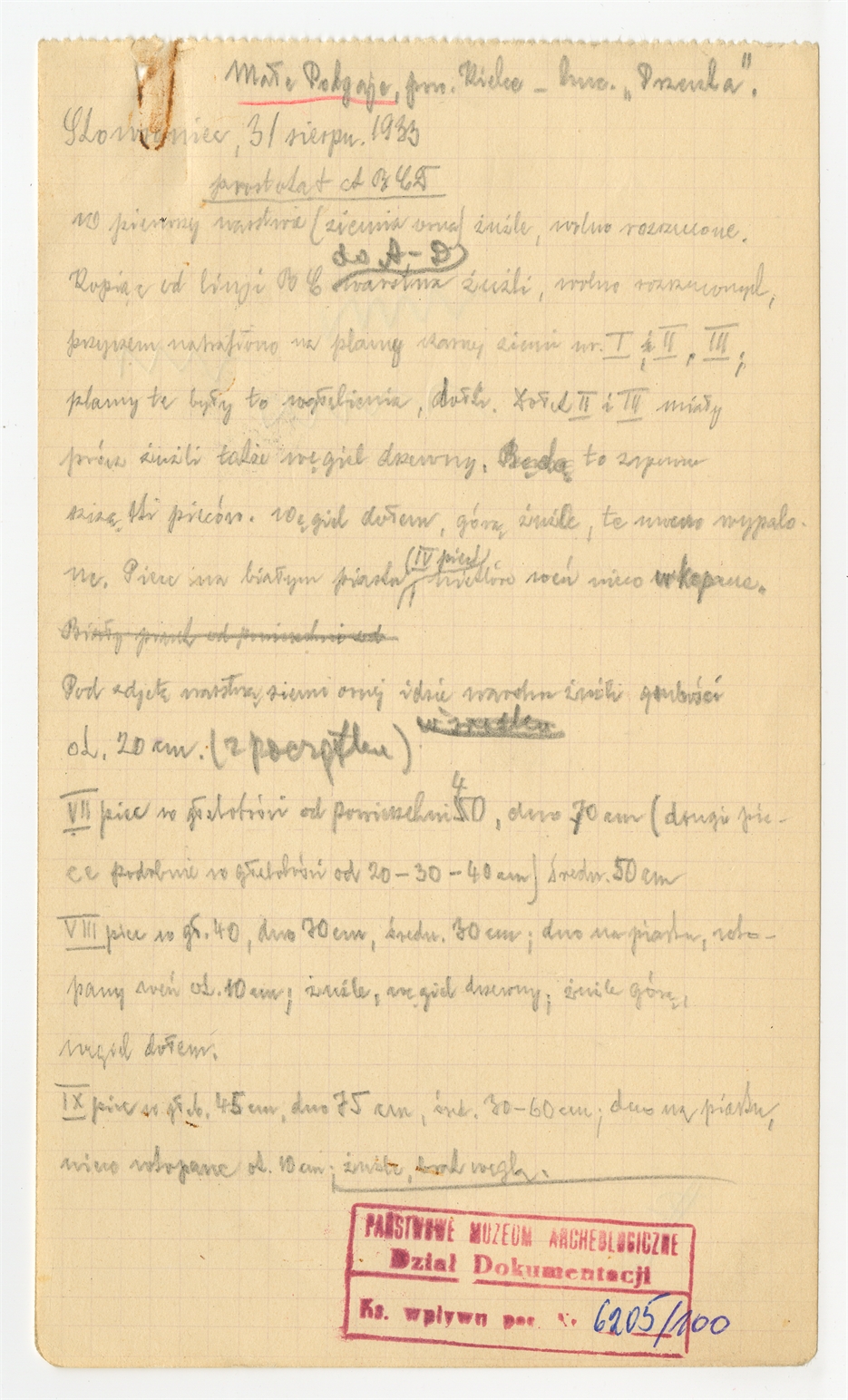 Rękopis - dziennik badań ze stanowiska Skowroniec (Małe Podgaje hucisko "Przemka") notatki z 31 sierpnia 1933 roku. Opisy warstw i obiektów.