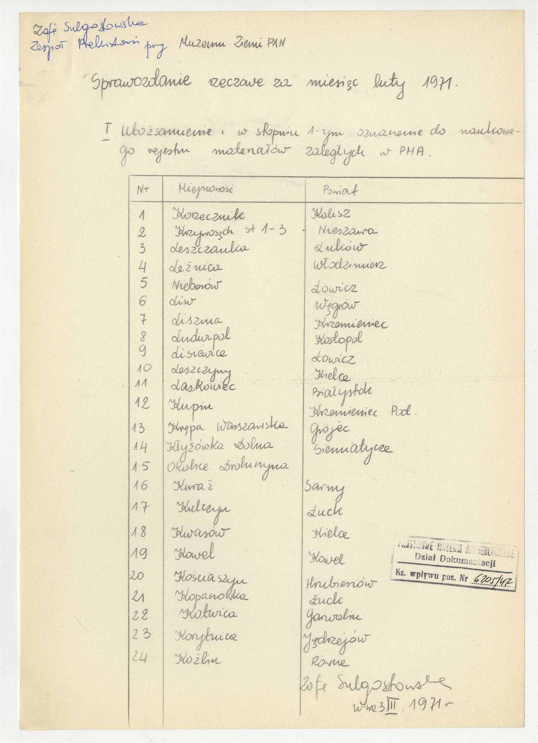 Rękopis - kopia dokumentu pt. "Sprawozdanie rzeczowe mgr J. Janiec za luty 1971" sporządzony przez Jolantę Janiec członka Zespołu Prehistorii przy Muzeum Ziemi PAN 3 III 1971 r. - strona 1