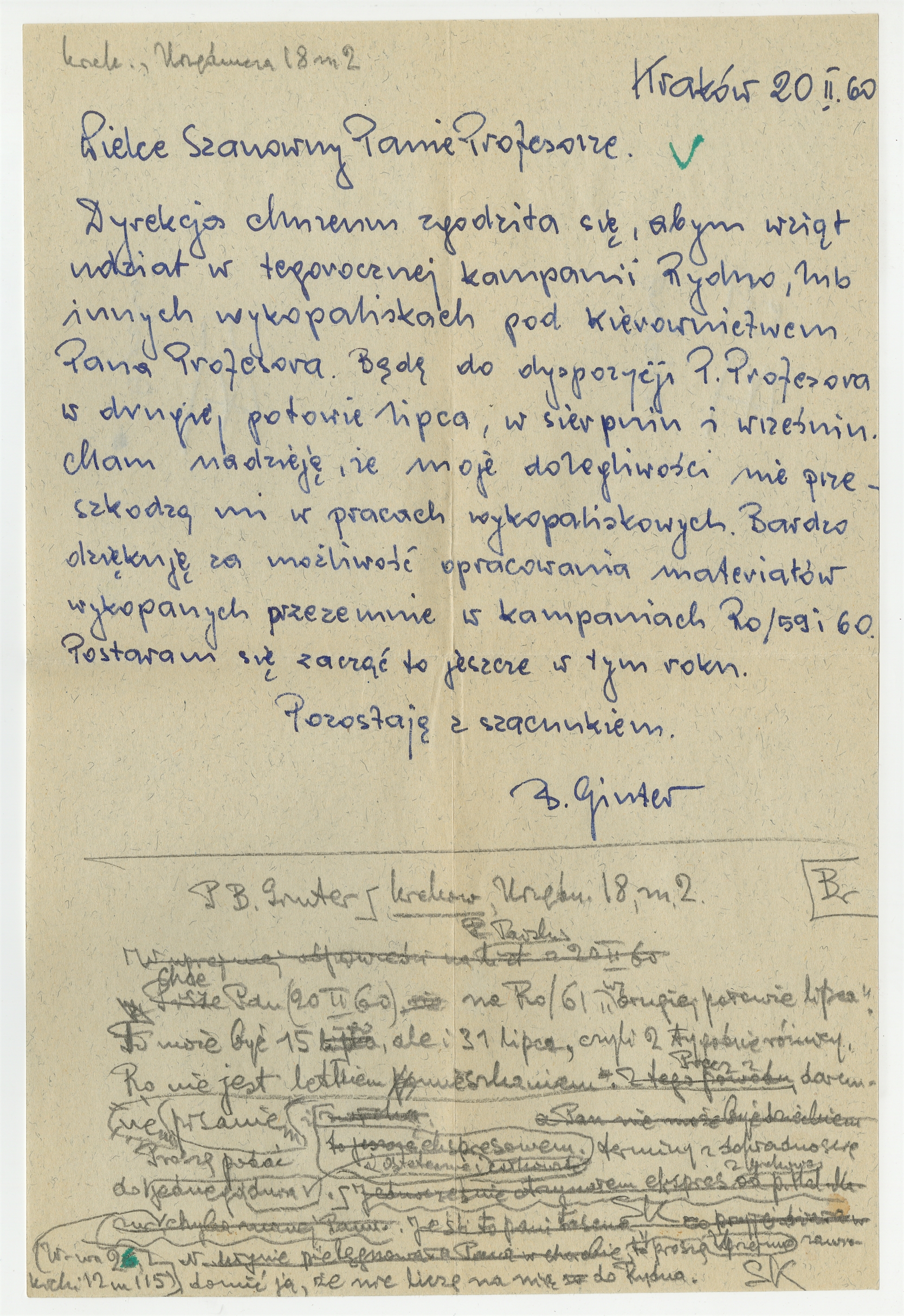 Rękopis - list Bolesława Gintera do Stefana Krukowskiego z dnia 20 II [19]60 roku. Na tej samej stronie rękopis - brudnopis odpowiedzi Stefana Krukowskiego na ten list