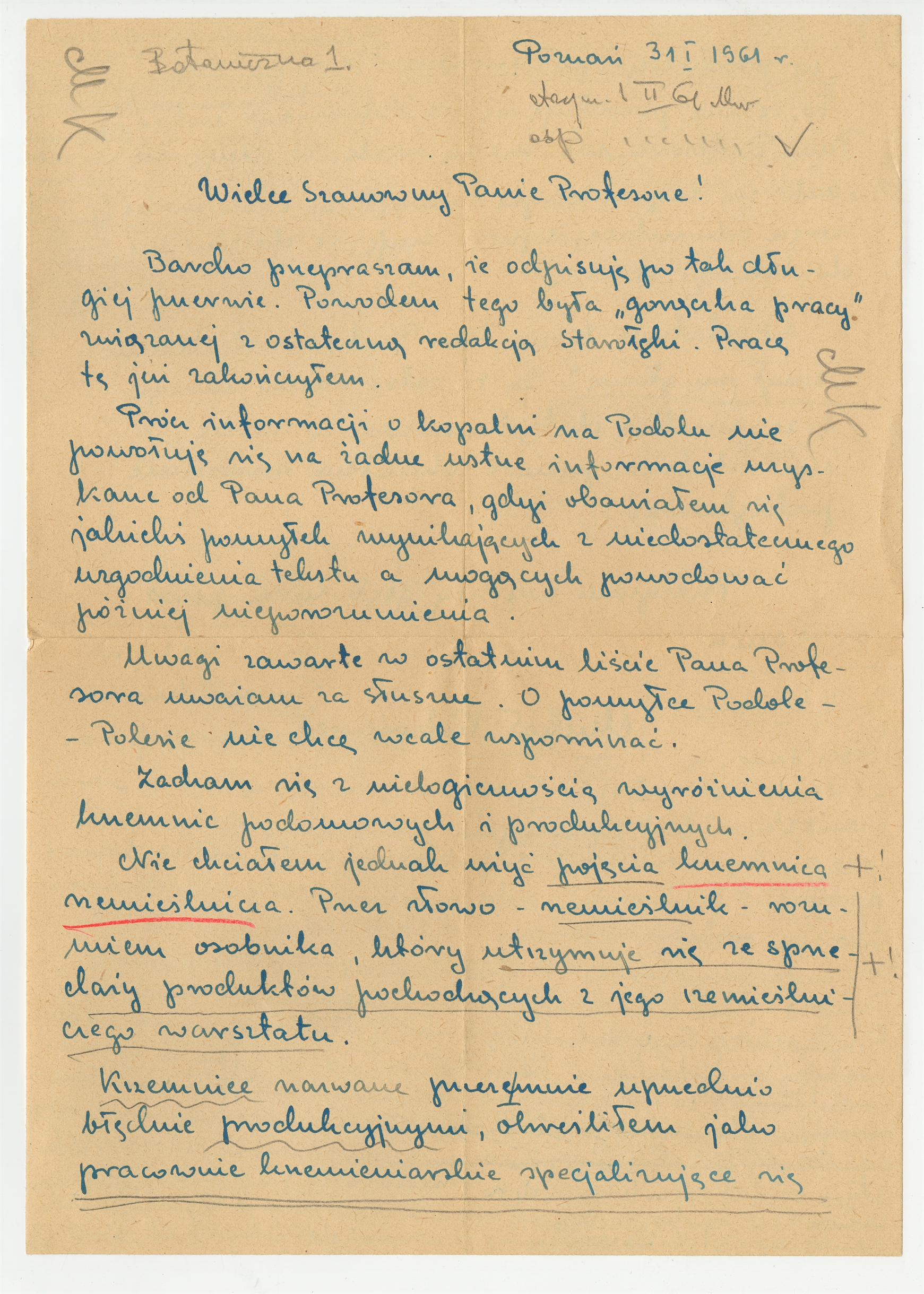 Rękopis - list Michała Kobusiewicza do Stefana Krukowskiego z dnia 31 I 1961 roku