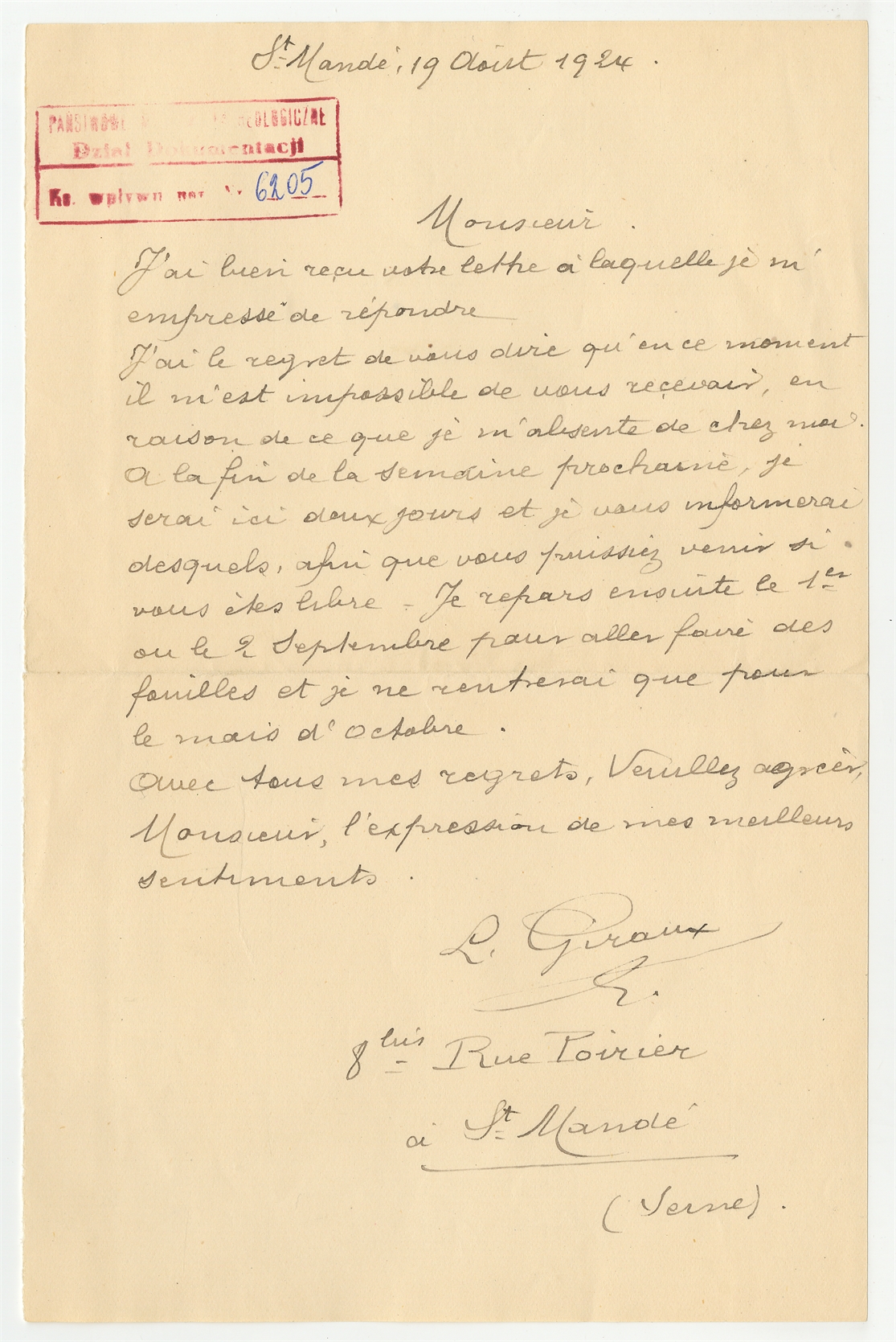 Rękopis - list w języku francuskim L. Giraux do Stefana Krukowskiego z dnia 19 sierpnia 1924 roku