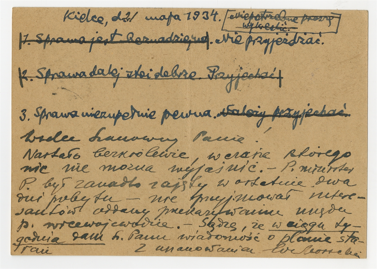 Rękopis listu na karcie pocztowej prof. E. Massalskiego do Stefana Krukowskiego w sprawie subsydium na inwestycje budowlane w Krzemionkach Kielce 21 maja 1934 r. - awers: "Wielce Szanowny Panie (…)"