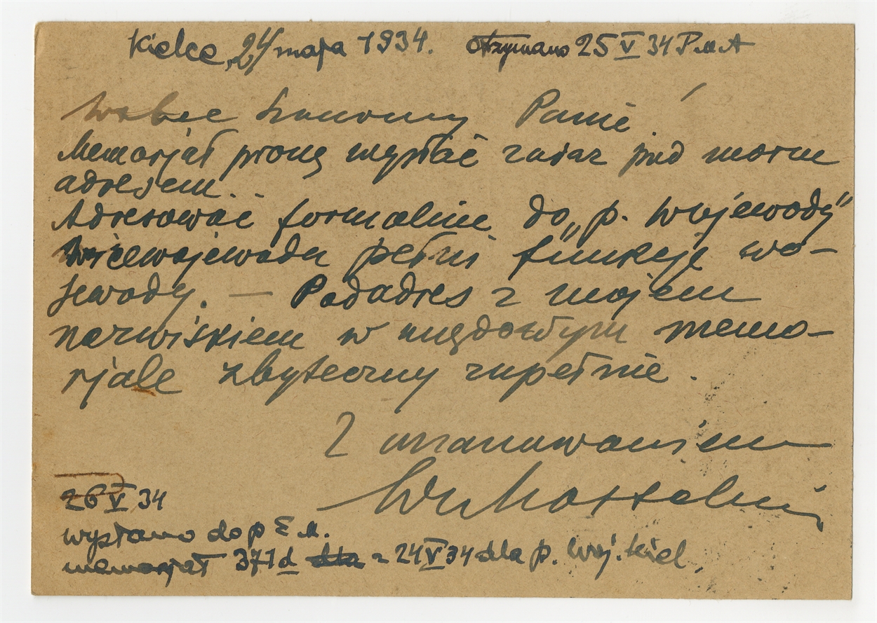 Rękopis listu na karcie pocztowej prof. E. Massalskiego do Stefana Krukowskiegona na temat memoriału w sprawie inwestycji w Krzemionkach Kielce 24 maja 1934 r. - awers: "Wielce Szanowny Panie (…)"