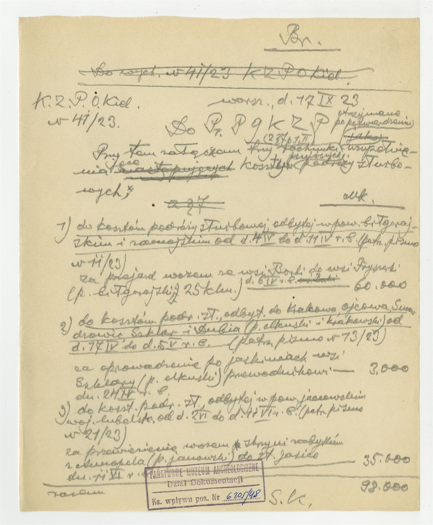 Rękopis notatek S. Krukowskiego zatytułowany "K.Z.P.O.Kiel. N 41/23" - "Do Pr. P g K Z P" dotyczący kosztów podróży służbowej odbytej w pow. biłgorajskim i zamojskim do Krakowa Ojcowa w pow. Janowskim - strona 1: "Przy tem załączam" … "razem 98.000" Warszawa 17 IX [19]23