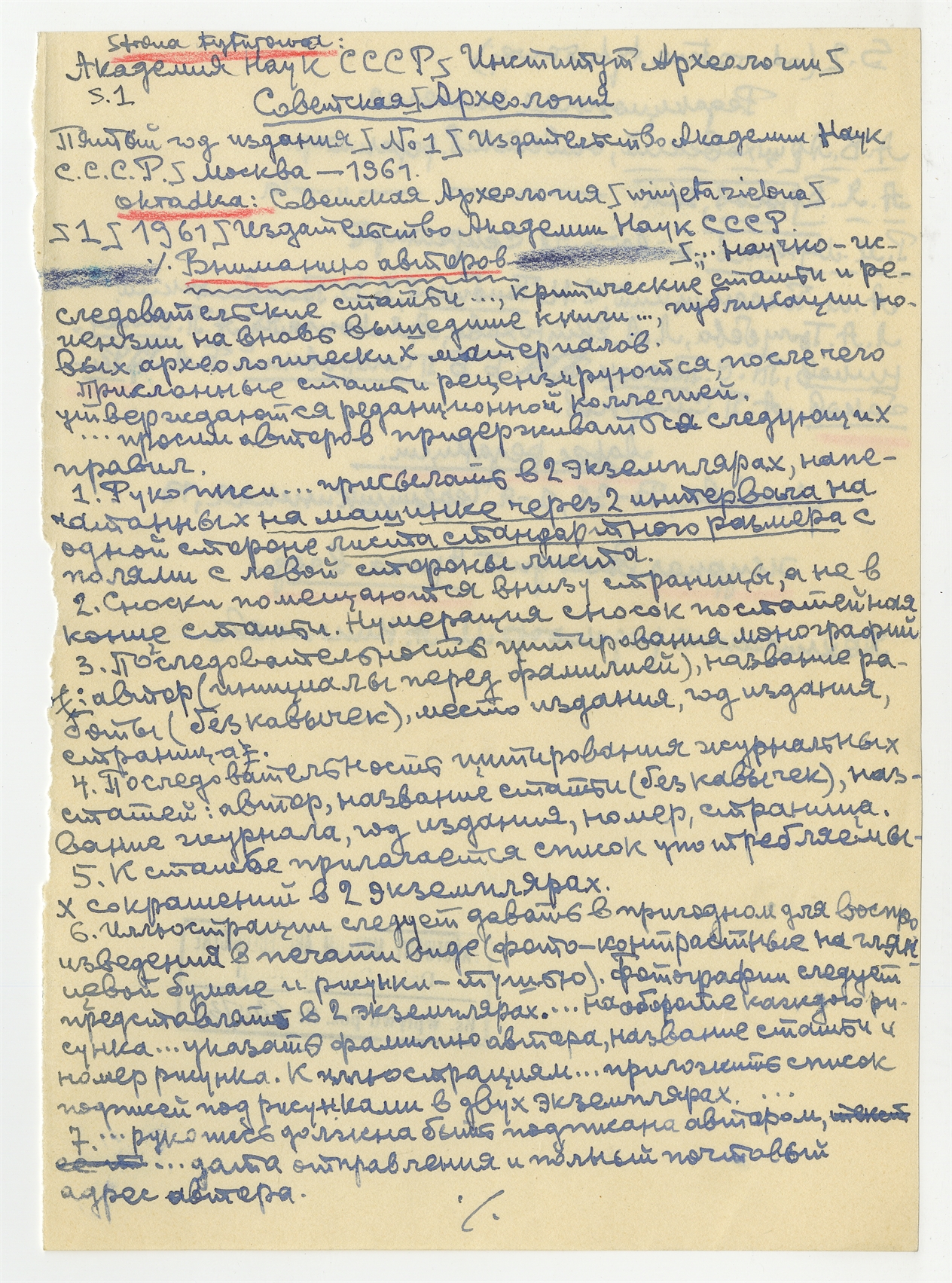 Rękopis - notatka i wypisy w j. rosyjskim Stefana Krukowskiego dotyczące strony tytułowej i okładki wydawnictwa "????????? ??????????" z roku 1961: "strona tytułowa…"