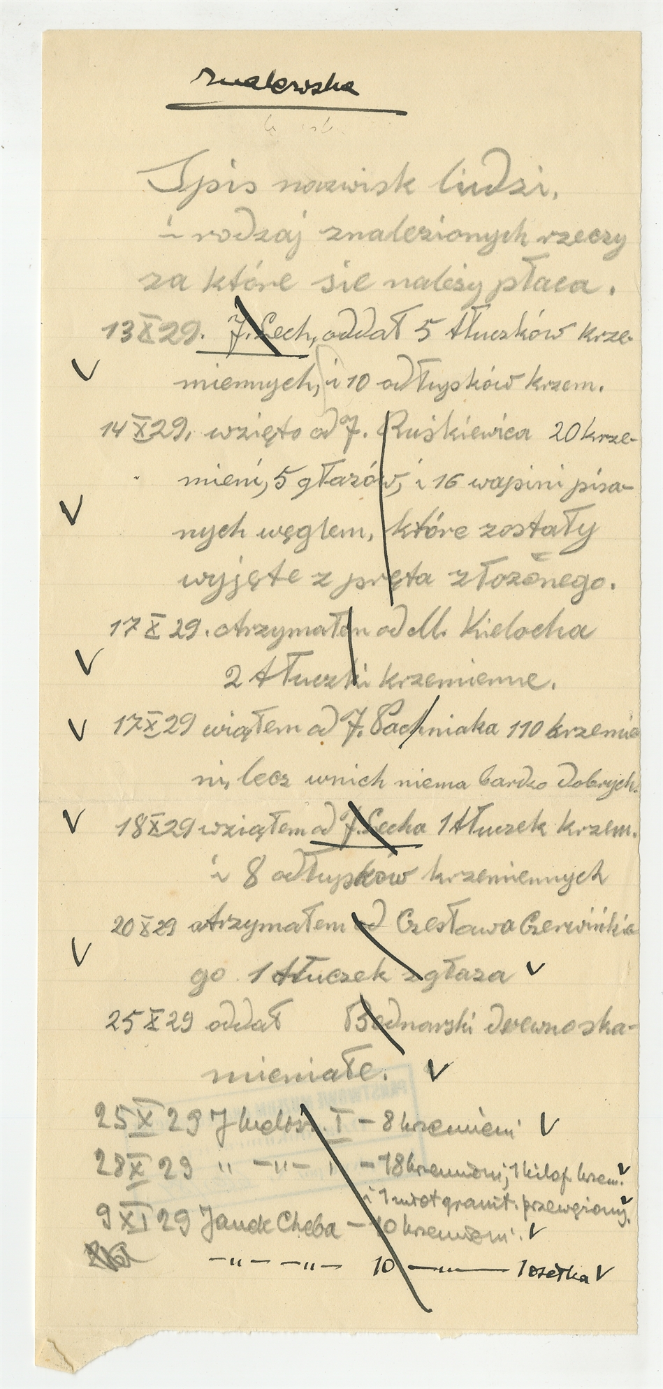 Rękopis - notatka NN: "Spis nazwisk ludzi i rodzaj znalezionych rzeczy za które się należy płaca"