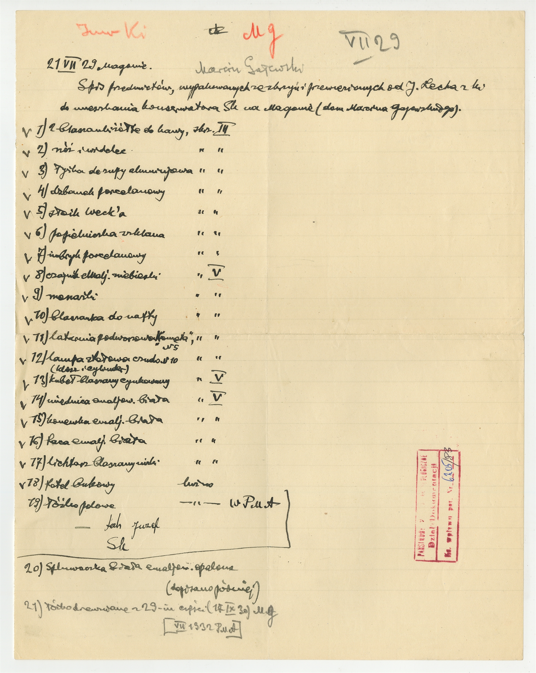 Rękopis - notatka Stefana Krukowskiego z dnia 21 VII [19]29 roku -"Spis przedmiotow wypakowanych ze skrzyni i przewiezionych od J. Lecha…"