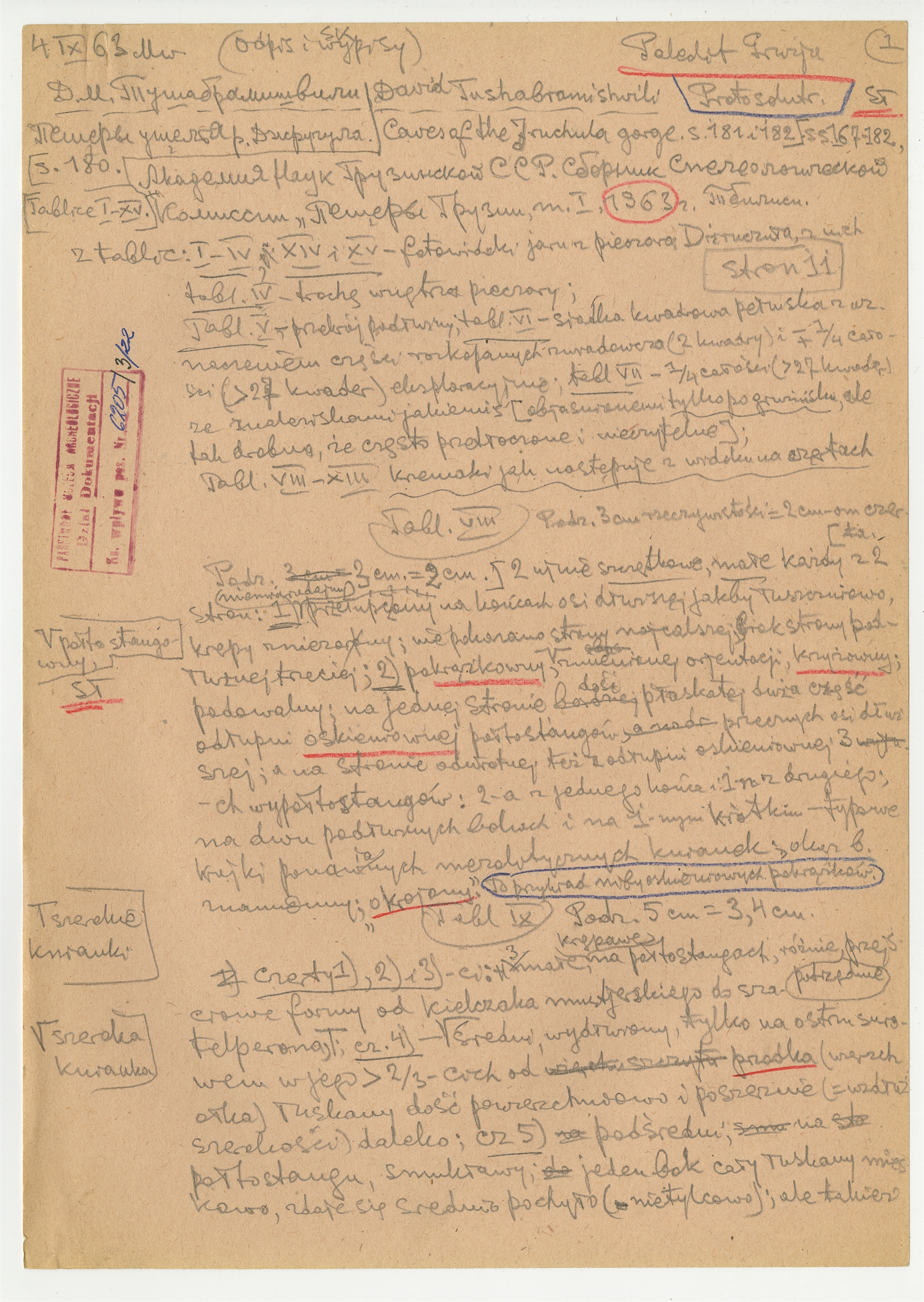 Rękopis - notatki i wypisy Stefana Krukowskiego z dnia 4 IX [19]63 roku dotyczące paleolitu Gruzji z publikacji rosyjskich. Strona 1