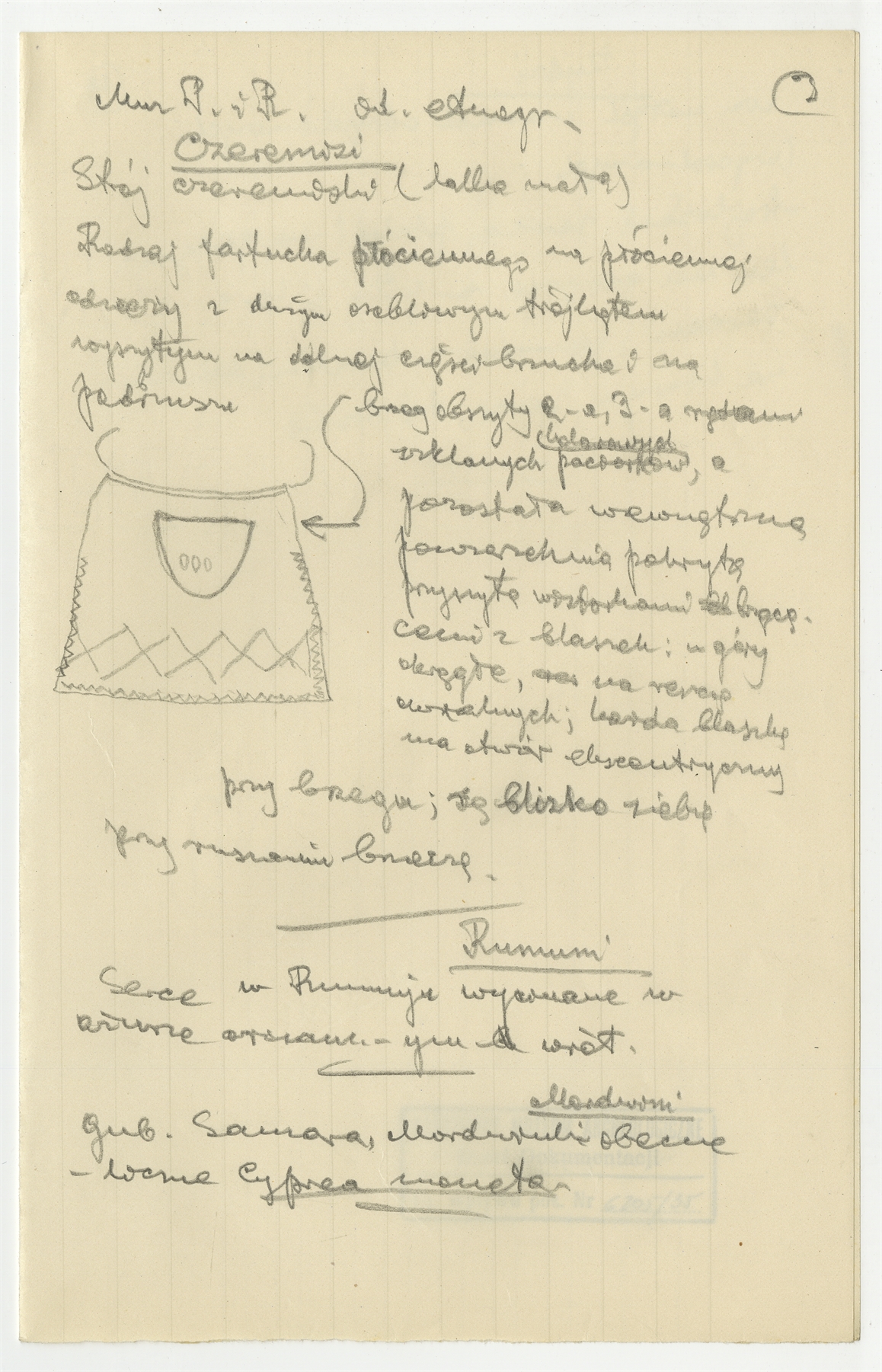 Rękopis - notatki Stefana Krukowskiego dotyczące motywu serca w stroju tradycyjnym różnych kultur na podstawie kolekcji Działu Etnograficznego Muzeum Przemysłu i Rolnictwa. Strona 3