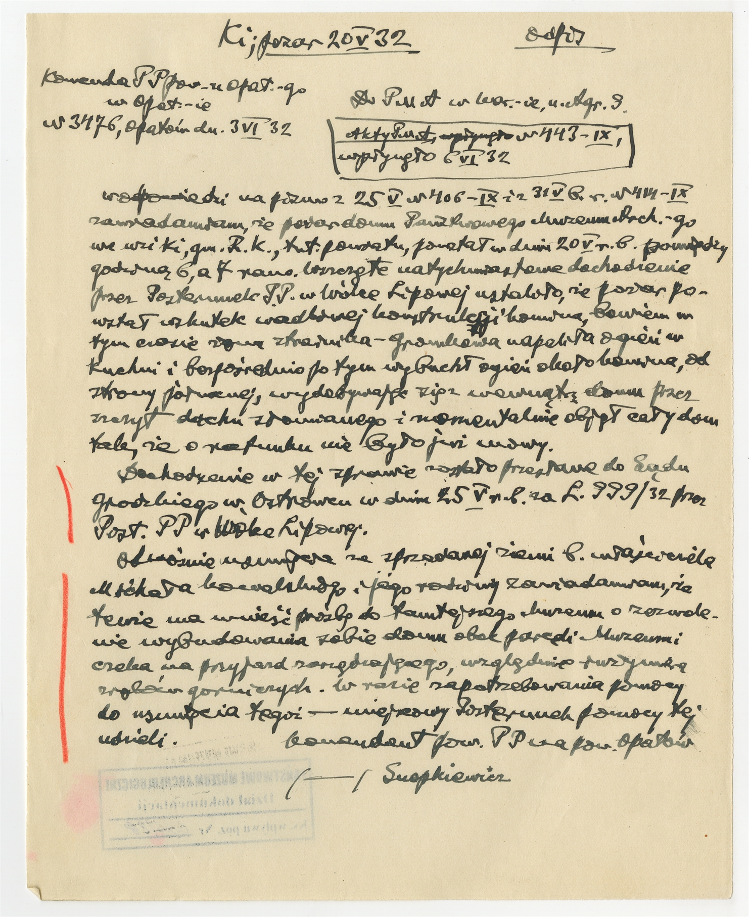 Rękopis - odpis pisma Komendanta Policji Państwowej pow. opatowskiego w Opatowie do Państwowego Muzeum Archeologicznego w sprawie pożaru domu PMA w Krzemionkach w dniu 20 V [9]32 r. Opatów 3 VI [19]32 r. (nr pisma 3476) - strona 1