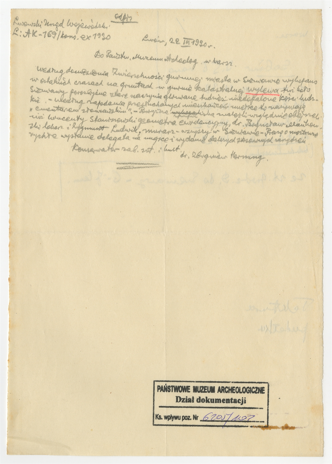 Rękopis - odpis pisma (o sygnaturze AK-169/kons. Ex 1930) Konserwatora Zab. Szt. i Kult. dr Zbigniewa Karnunga do Państwowego Muzeum Archeologicznego w Warszawie w sprawie znalezisk dokonanych na gruntach w gminie katastralnej Wylewo koło Sieniawy - strona 1: "Według doniesienia" ... "stosownych zarządzeń" Lwów 22 III 1930 (bez numeru strony)
