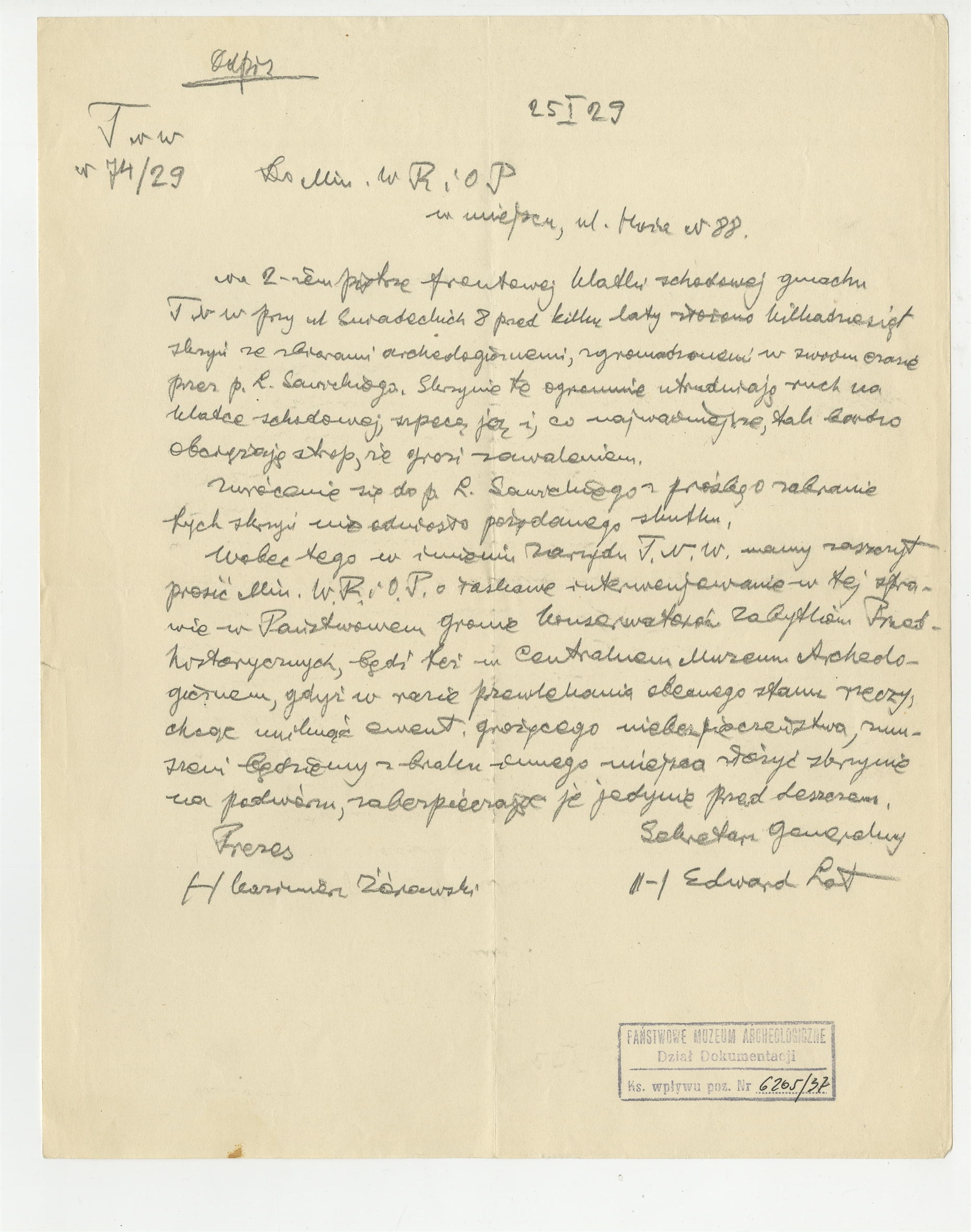 Rękopis - odpis pisma Towarzystwa Naukowego Warszawskiego do Ministerstwa Wyznań Religijnych i Oświecenia Publicznego z prośbą o interwencję u Państwowego Grona Konserwatorów Zabytków Przedhistorycznych lub w Centralnym Muzeum Archeologicznym w sprawie zabrania z pomieszczeń Zakładu Archeologii I.N.A. T.N.W materiałów archeologicznych po L. Sawickim Warszawa 25 I 1929 - strona 1