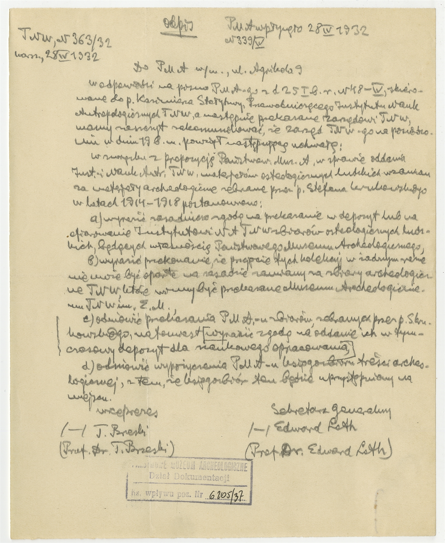 Rękopis - odpis pisma Towarzystwa Naukowego Warszawskiego do PMA w sprawie propozycji PMA przekazania do Instytutu Nauk Antropologicznych TNW materiałów osteologicznych w zamian za materiały archeologiczne zebrane przez Stefana Krukowskiego Warszawa 28 IV 1932 - strona 1