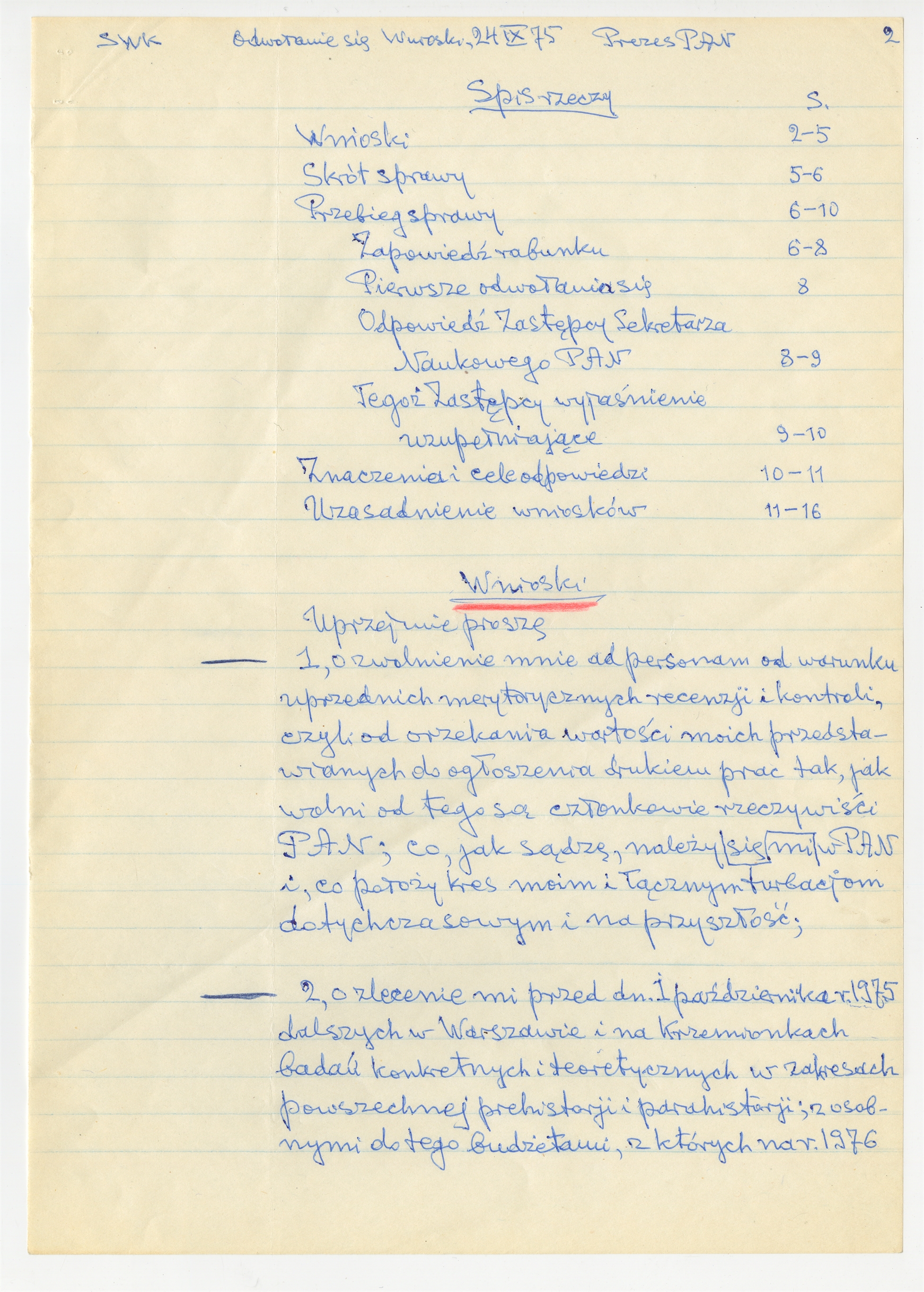 Rękopis - odwołanie Stefana Krukowskiego z dnia 24 IX 1975 roku do Prezesa PAN. (załącznik listu Prezesa PAN do Stefana Krukowskiego z dnia 30 września 1975) - strona 2 - spis rzeczy wnioski