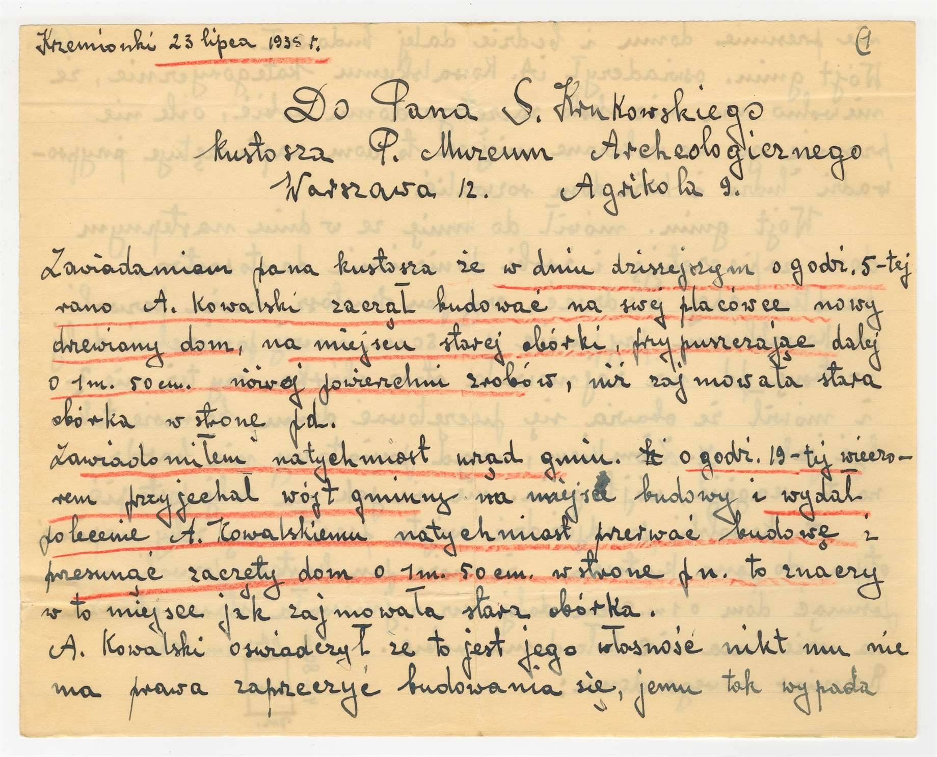 Rękopis - pismo C. Czerwińskiego do prof. Stefana Krukowskiego Krzemionki 23 VII 1935 r. - "Zawiadamiam pana kustosza…"