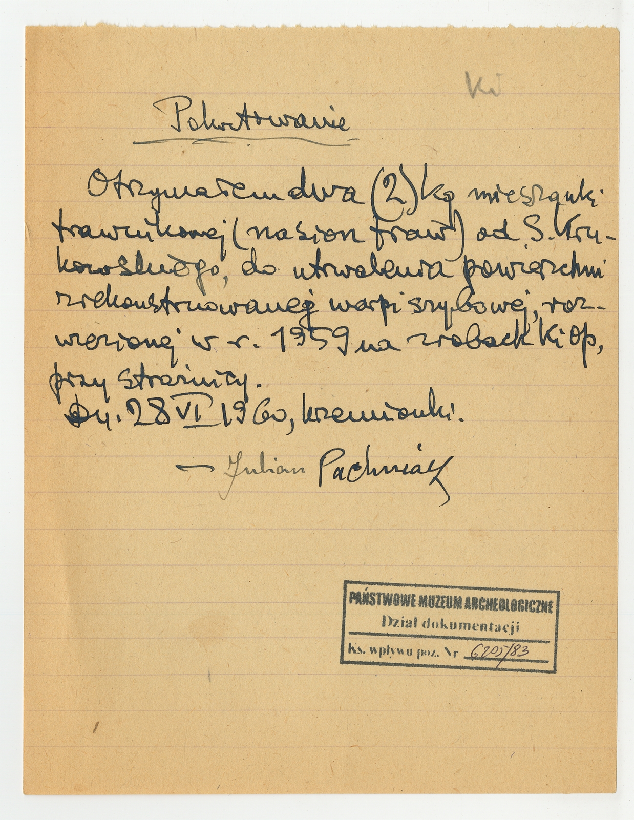 Rękopis - pokwitowanie Juliana Pachniaka z dnia 28 VI 1960 roku na dwa kg mieszanki trawnikowej