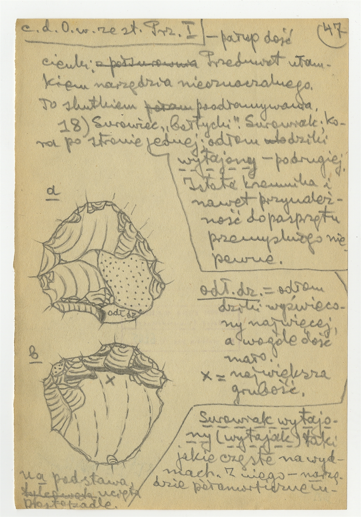 Rękopis pracy pt. "Materjał 1-y do Pasprzęt przemyski" - strona 53: "17. Szczątkowy nieoznaczalny ścieniec (…)" c.d. "18. Surowec 'bałtycki'. Surowiak (…)"