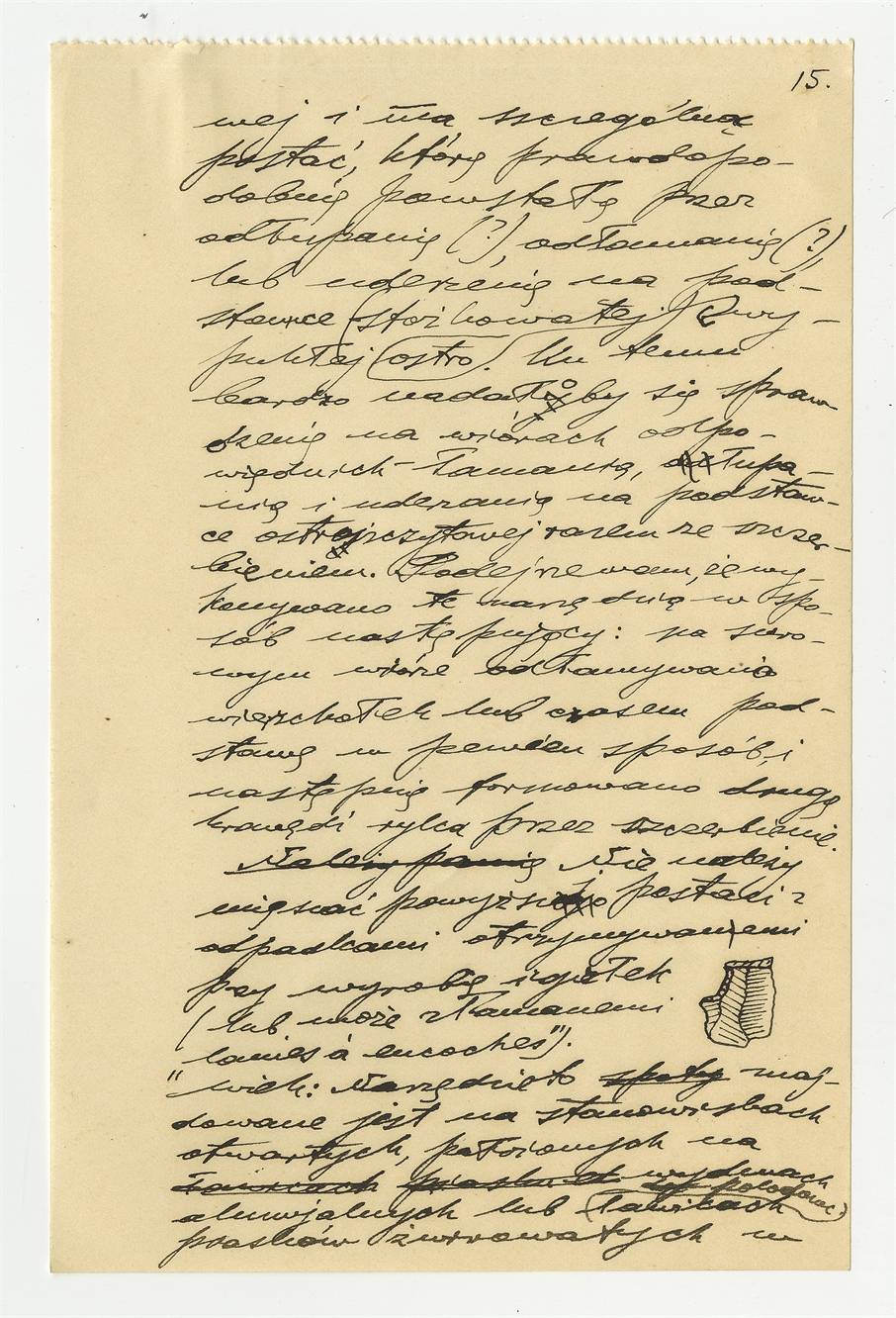 Rękopis pracy pt. "Skrobacz i nóż. Monografja z dziedziny paleotechnologji" - strona 15: "(…) i ma szczególną postać (…)"