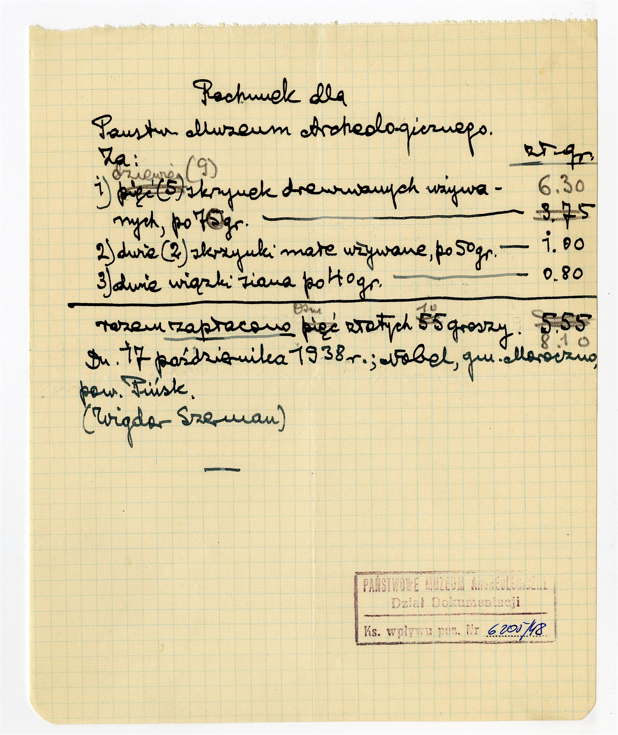 Rękopis - rachunek wystawiony przez Wigdara Szermana dla Państwowego Muzeum Archeologicznego za 11 skrzynek i dwie wiązki siana - strona 1: "dziewięć (9) skrzynek" … "Wigdar Szerman" Nobel 17 października 1938