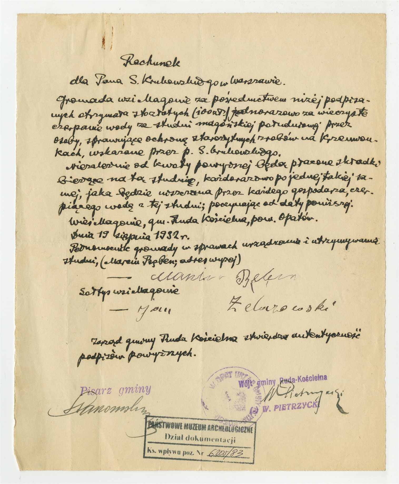 Rękopis - rachunek z dnia 19 sierpnia 1932 roku od Gromady wsi Magonie dla Stefana Krukowskiego za "wieczyste czerpanie wody ze studni magońskiej"