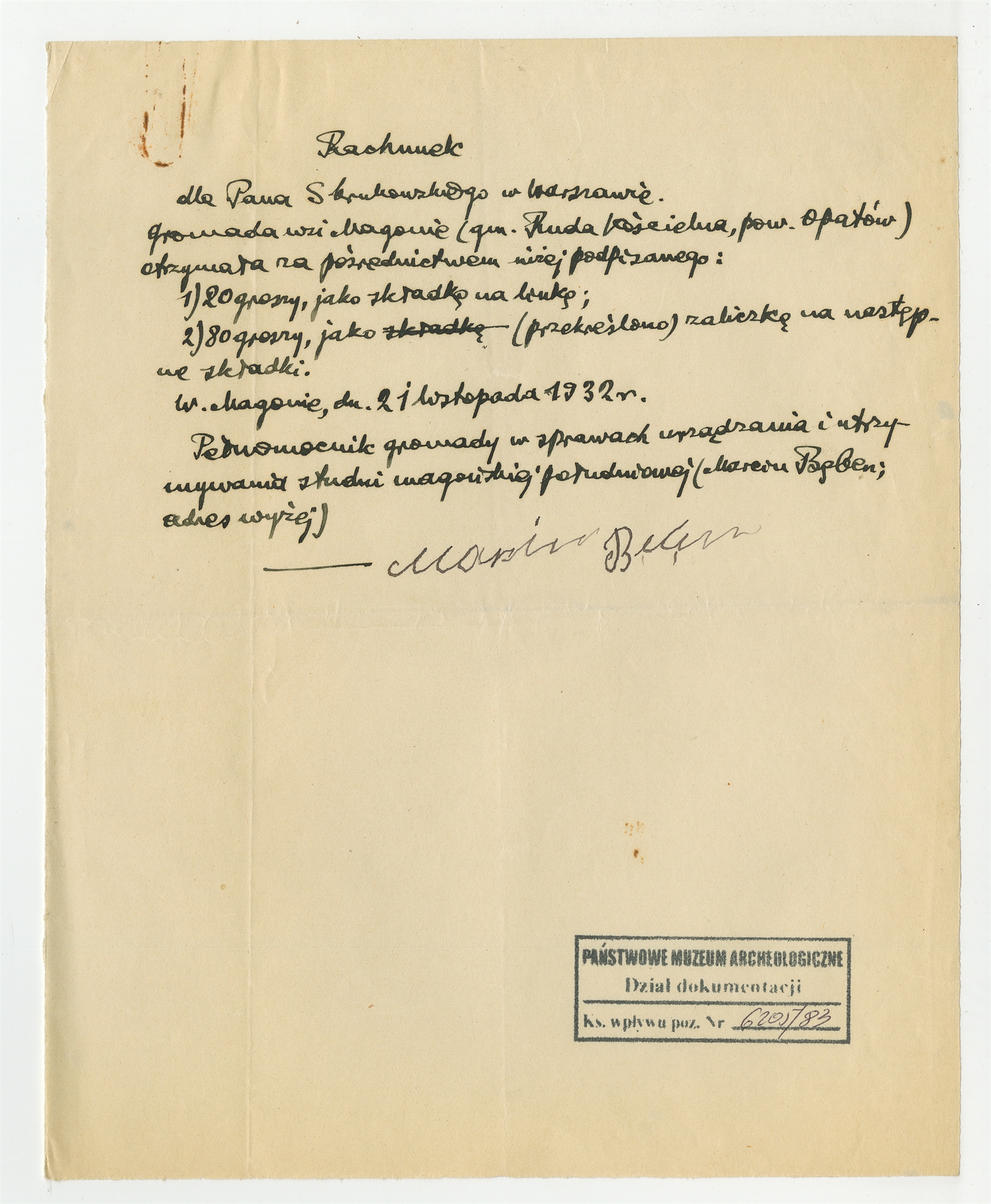 Rękopis - rachunek z dnia 21 listopada 1932 roku od Gromady wsi Magonie dla Stefana Krukowskiego za "składke na linkę"