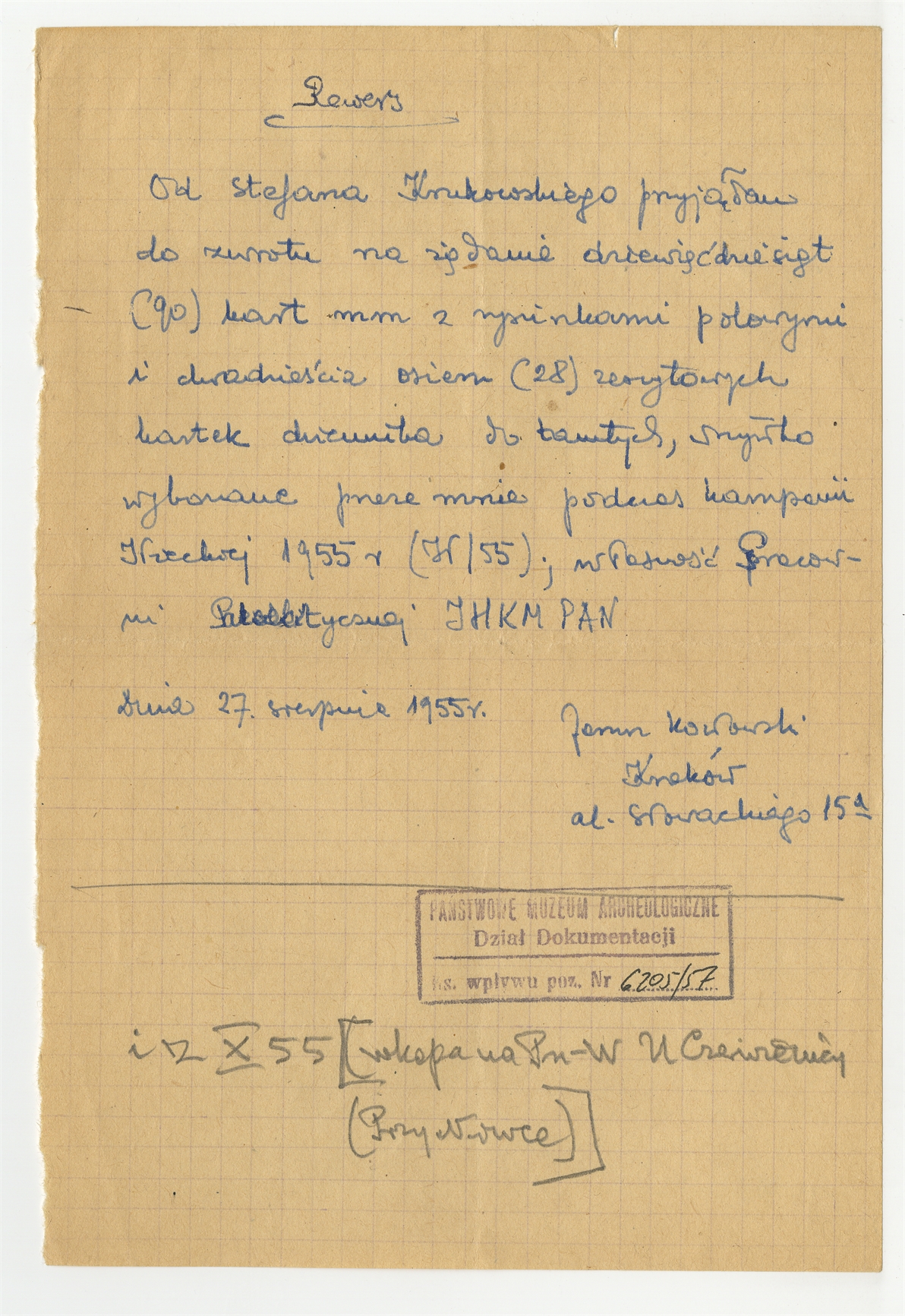 Rękopis - rewers Janusza Kozłowskiego z dnia 27 sierpnia 1955 roku roku na wypożyczenie 90 kart z rysunkami polowymi oraz dziennika z badań w Iłży