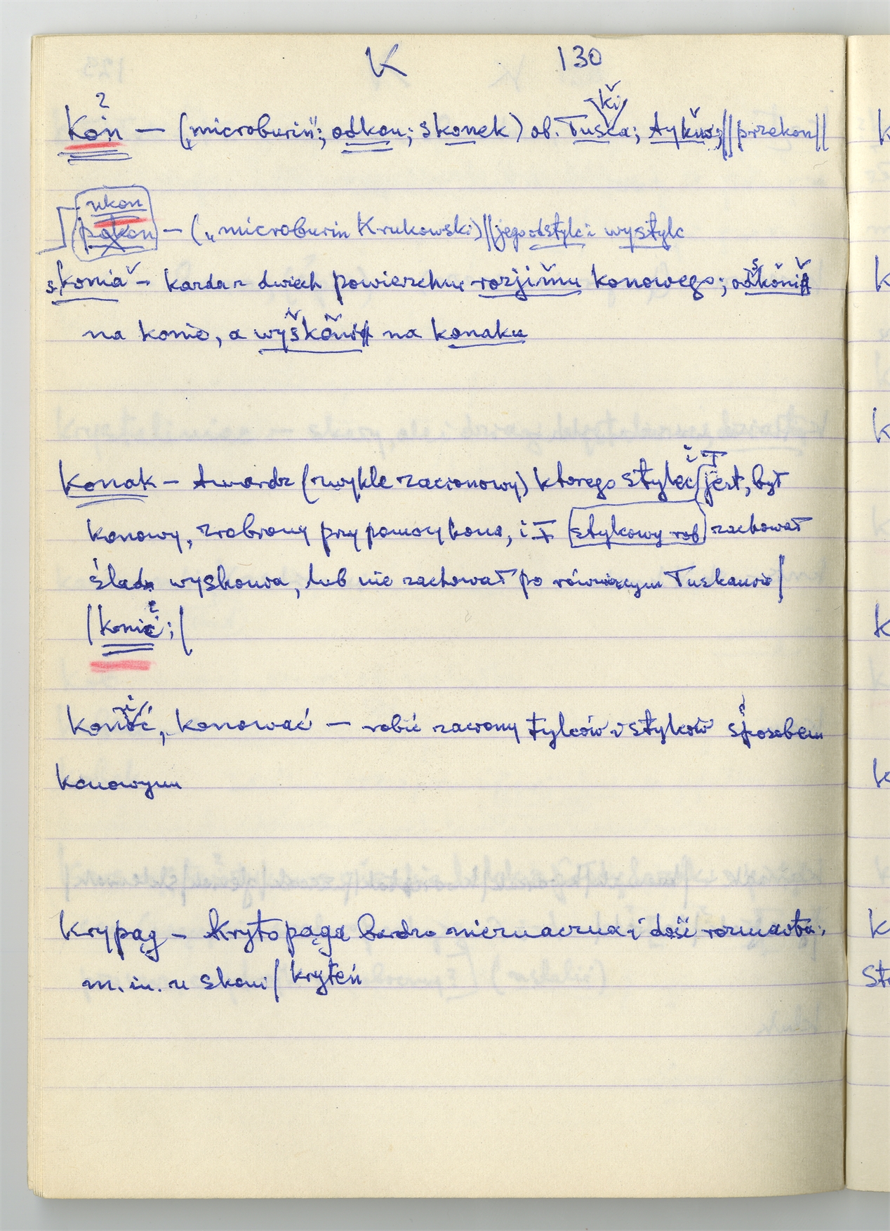 Rękopis słownika sporządzony w zeszycie w linię zatytułowany "K-O i K2 s. 121-240" - strona 11: hasła słownikowe na literę K c.d. (autorska strona 130)