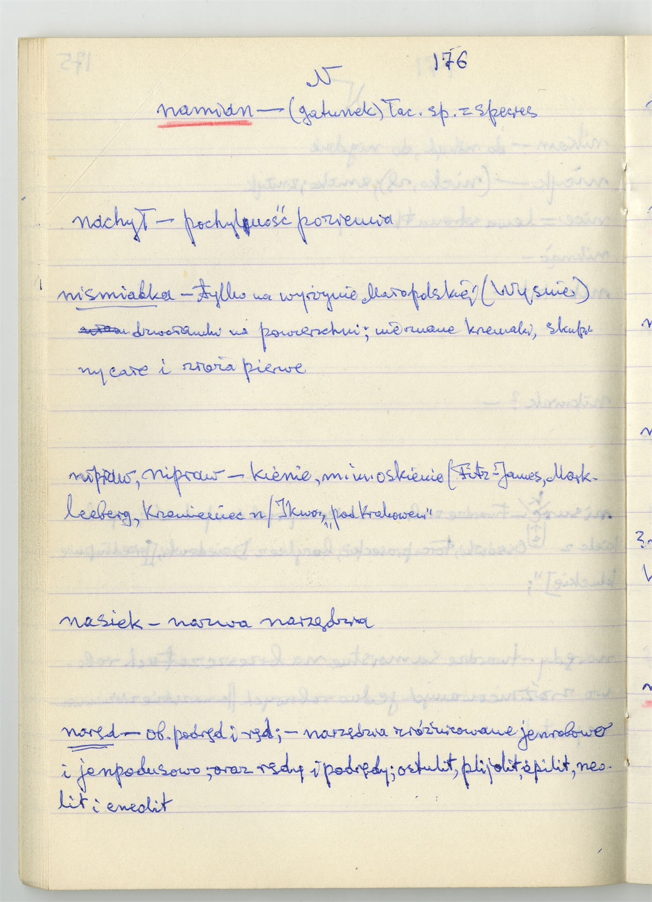 Element 42 - Rękopis słownika sporządzony w zeszycie w linię zatytułowany "K-O i K2 s. 121-240" - strona 42: hasła słownikowe na literę N c.d. (autorska strona 176)