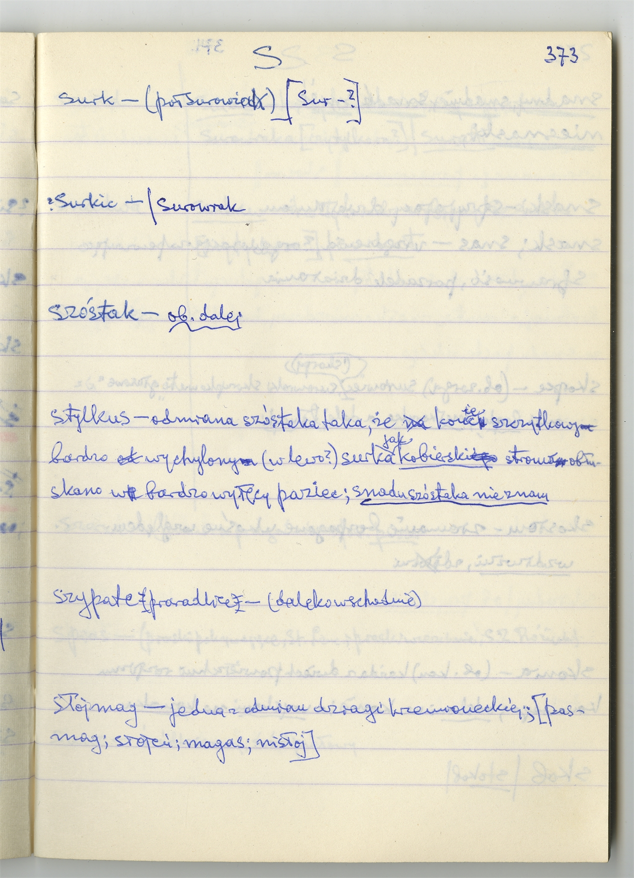 Rękopis słownika sporządzony w zeszycie w linię zatytułowany "Słownik S-Z Ż Ź s. 361-480" - strona 14: hasła słownikowe na literę S c.d. (autorska strona 373)