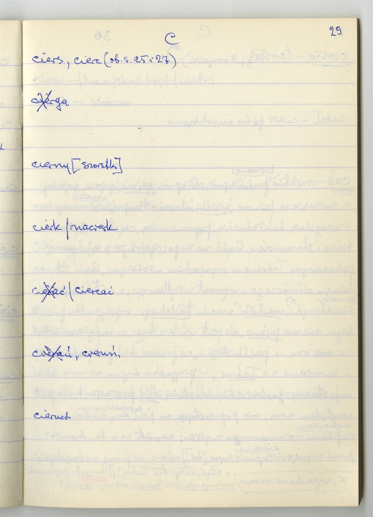 Element 25 - Rękopis słownika sporządzony w zeszycie w linię zatytułowany "Zumia stosowana Br. 1 A-J i D2 s. 1-120" - strona 25: hasła słownikowe na literę C c.d. (autorska strona 29)