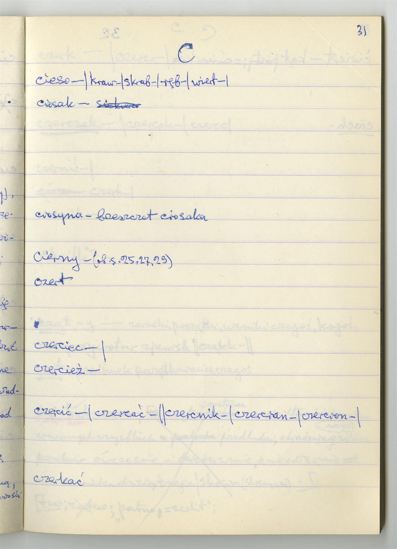 Rękopis słownika sporządzony w zeszycie w linię zatytułowany "Zumia stosowana Br. 1 A-J i D2 s. 1-120" - strona 27: hasła słownikowe na literę C c.d. (autorska strona 31)
