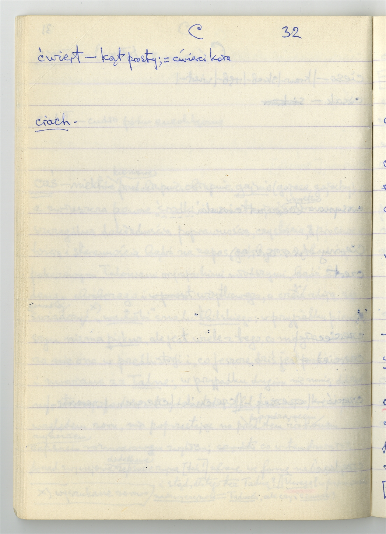 Rękopis słownika sporządzony w zeszycie w linię zatytułowany "Zumia stosowana Br. 1 A-J i D2 s. 1-120" - strona 28: hasła słownikowe na literę C c.d. (autorska strona 32)