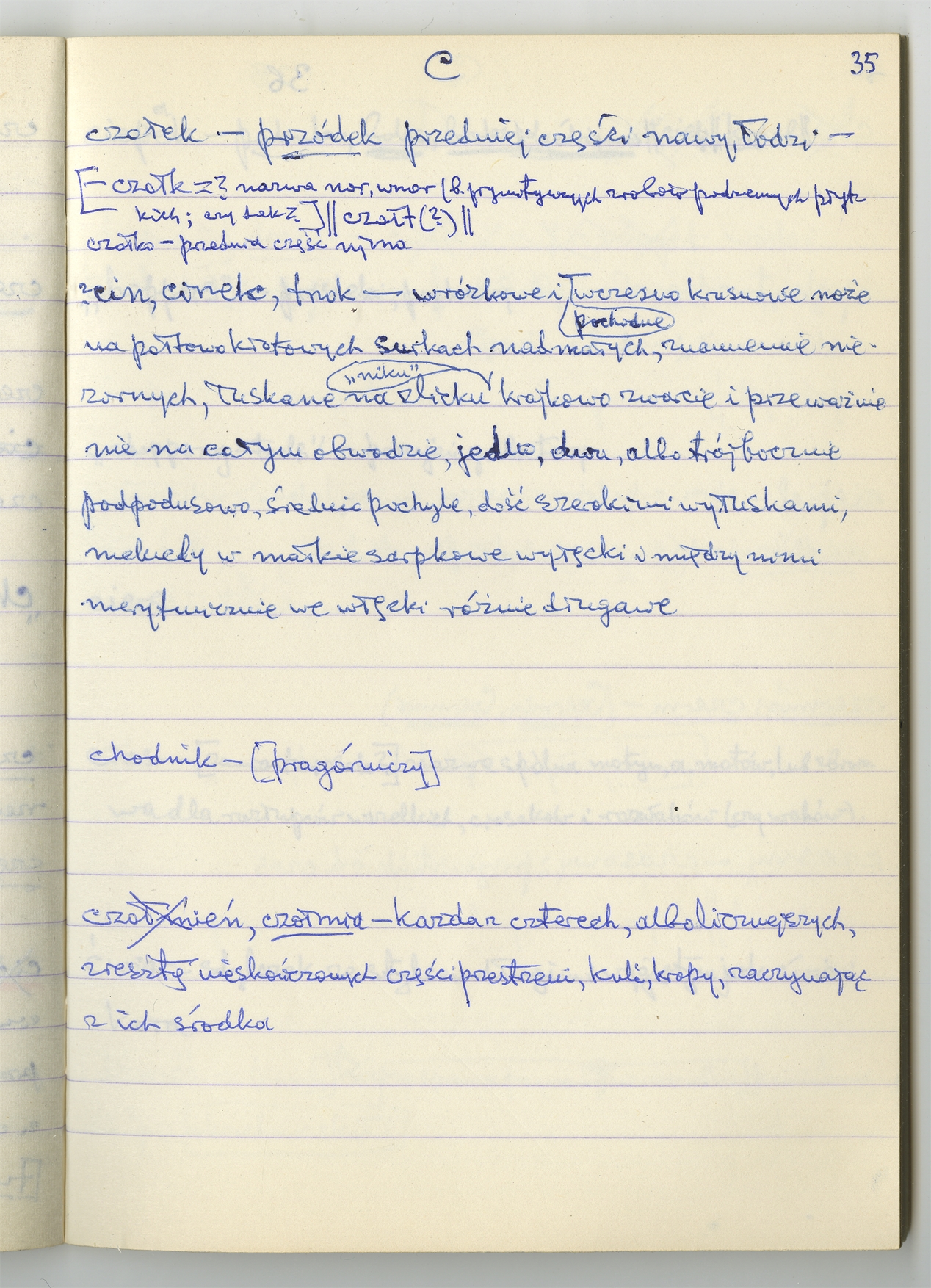 Rękopis słownika sporządzony w zeszycie w linię zatytułowany "Zumia stosowana Br. 1 A-J i D2 s. 1-120" - strona 30: hasła słownikowe na literę C c.d. (autorska strona 35)