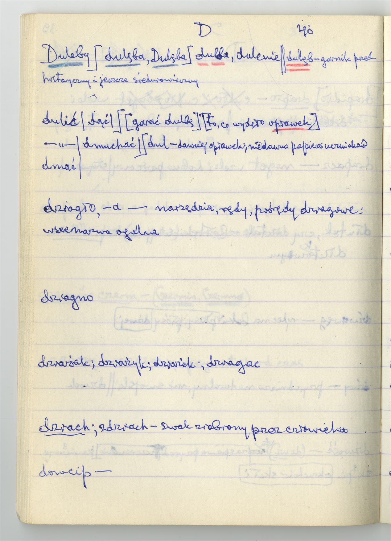 Rękopis słownika sporządzony w zeszycie w linię zatytułowany "Zumia stosowana Br. 1 A-J i D2 s. 1-120" - strona 34: hasła słownikowe na literę D c.d. (autorska strona 40)