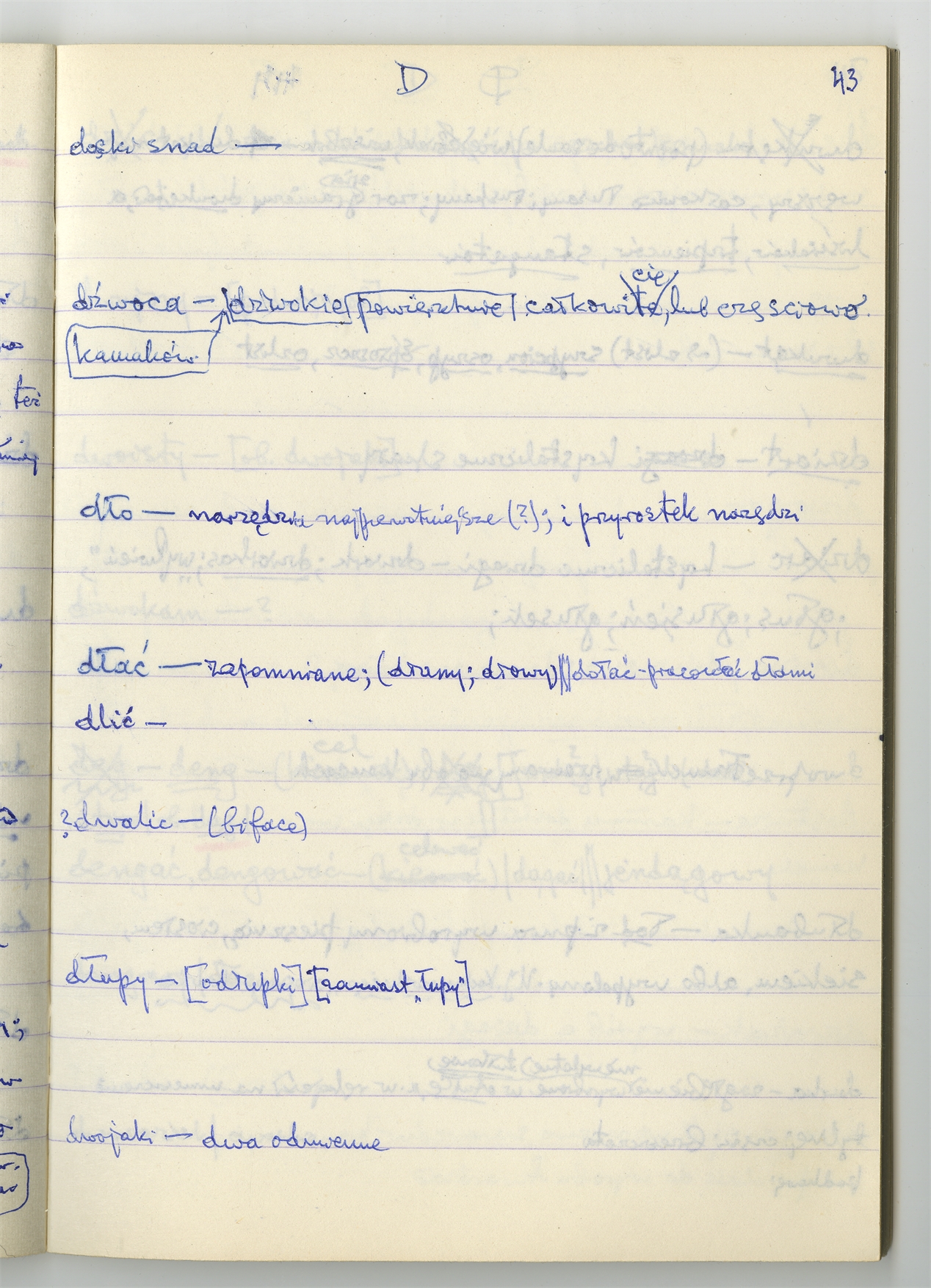 Rękopis słownika sporządzony w zeszycie w linię zatytułowany "Zumia stosowana Br. 1 A-J i D2 s. 1-120" - strona 37: hasła słownikowe na literę D c.d. (autorska strona 43)