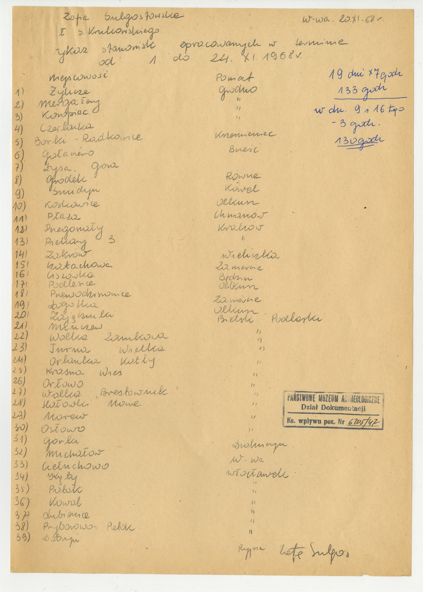 Rękopis wykazu stanowisk opracowanych w dniach 1-24 XI 1968 r. przez Zofię Sulgostowską członka Zespołu prof. Stefana Krukowskiego przy Muzeum Ziemi PAN Warszawa 20 listopada 1968 r.