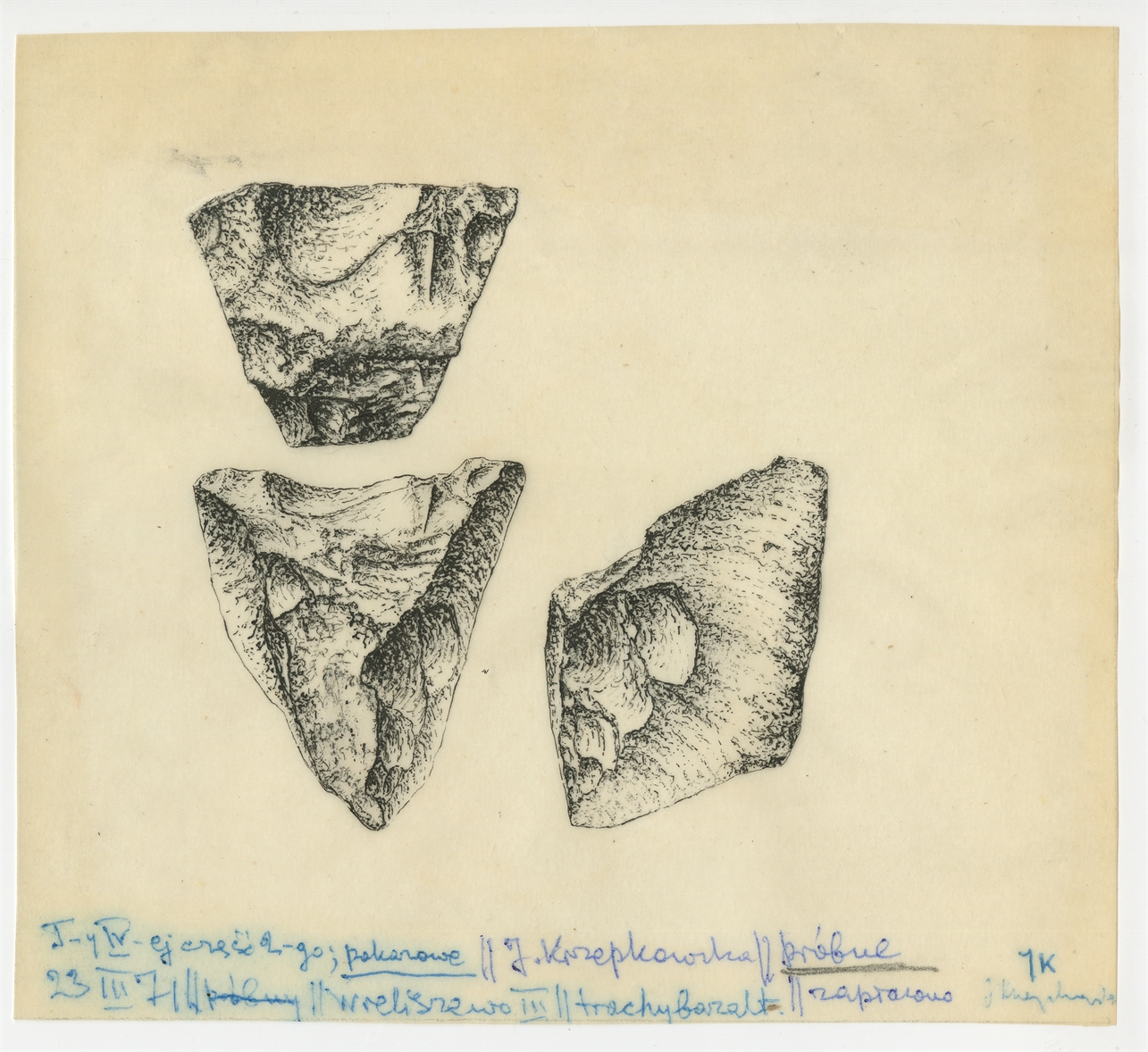 Rysunki wyrobów krzemiennych z Wieliszewa III wykonane piórkiem i tuszem na kalce technicznej przez J. Krzepkowską - strona 1: podpisana "T-y IV-ej części 2 -go; pokazowe" 23 III [19]71
