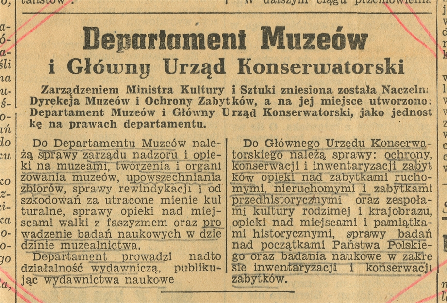 - strona 1: "Zarządzeniem Ministra Kultury i Sztuki zniesiona została Naczelna Dyrekcja Muzeów i Ochrony Zabytków (...)"