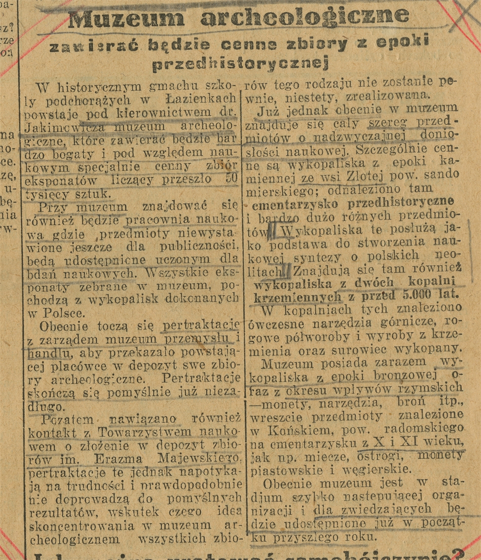Wycinek prasowy: Muzeum Archeologiczne zawierać będzie cenne zbiory z epoki przedhistorycznej "Przegląd wieczorny" nr 289 17 grudnia 1927 s. nieczytelna - strona 1: "W historycznym gmachu szkoły podchorążych w Łazienkach (…)"
