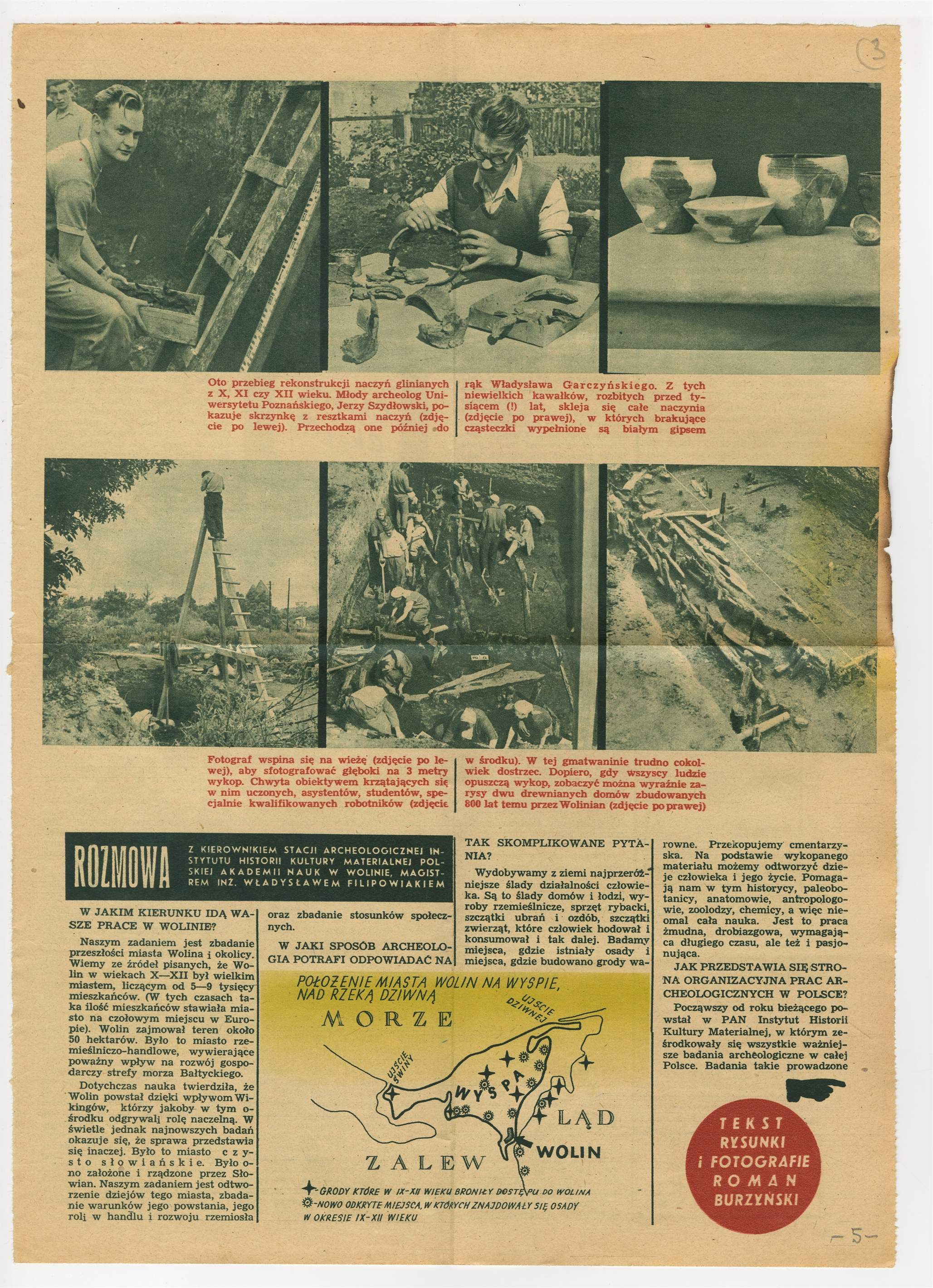 Wycinek prasowy pochodzący z "Przekroju" Nr 489 22 VIII 1954 ss. 4-6 zatytułowany "Wolin - stanowisko 4" - strona 2: "Naszym zadaniem jest" … "Badania takie prowadzone" (strona 3)